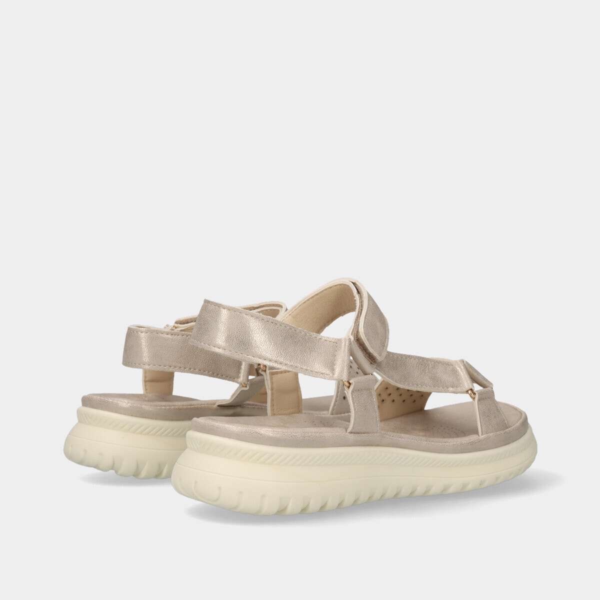 Sandálias leves e confortáveis em bege metalizado, com palmilha em espuma macia que garante leveza e bem-estar, e tira de velcro para ajuste prático.