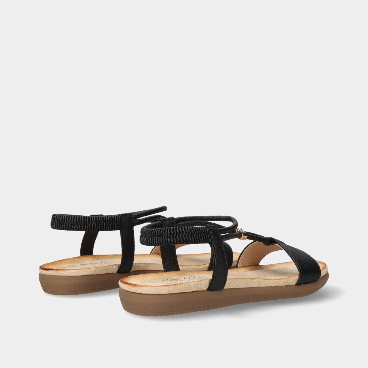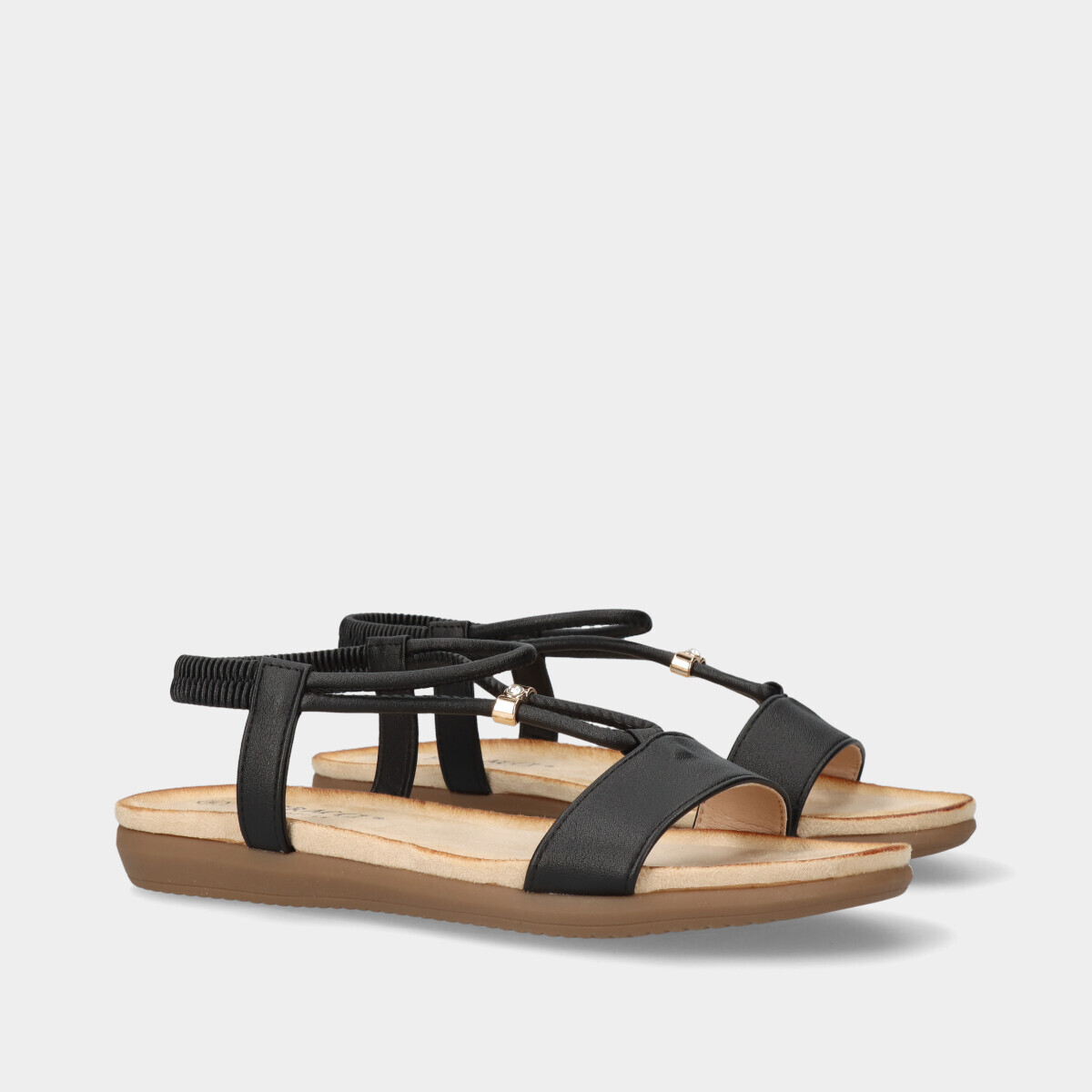 Sandália de conforto em preto para mulher, com elástico no calcanhar para um ajuste confortável e seguro, e ajuste no peito do pé feito através de uma aplicação com um brilhante.