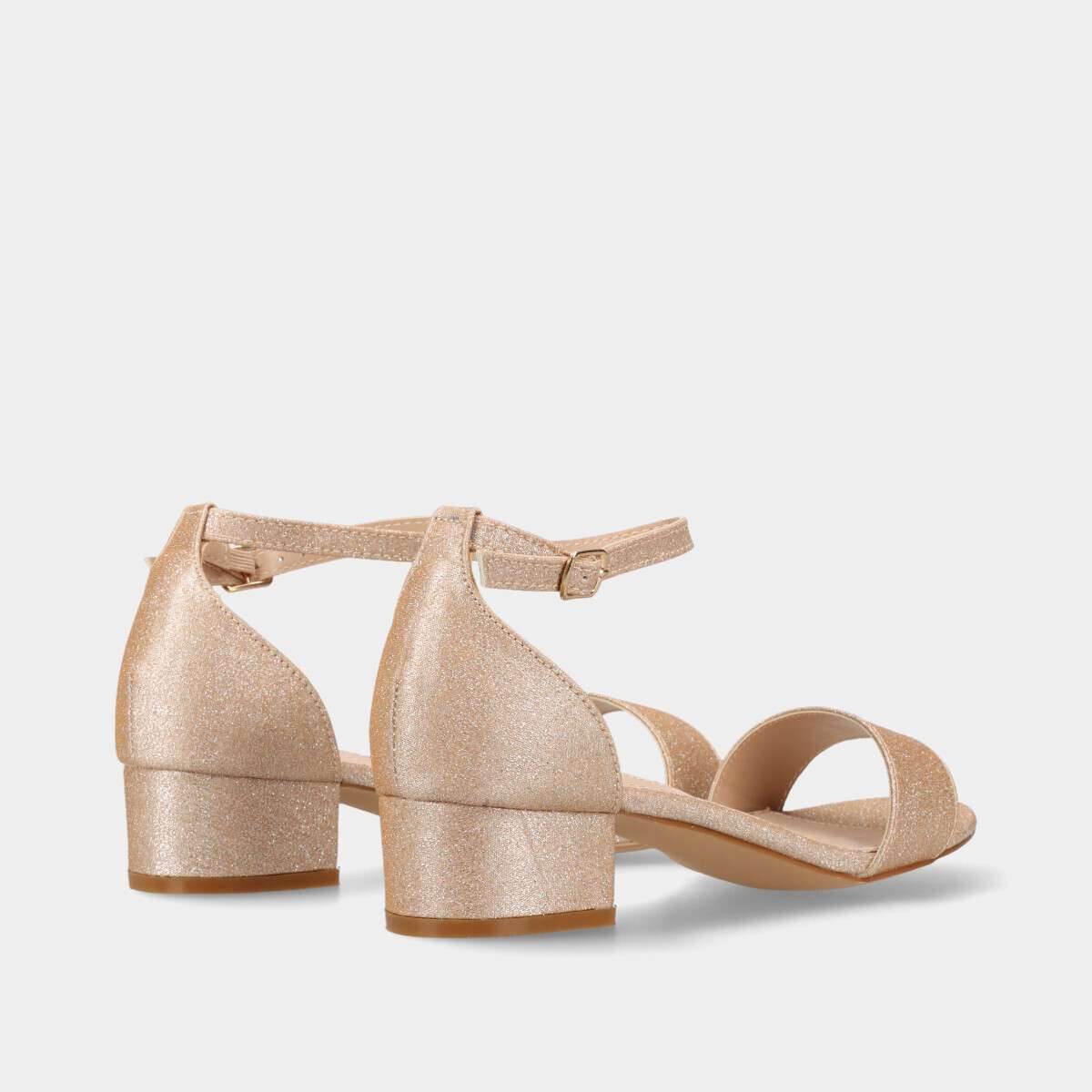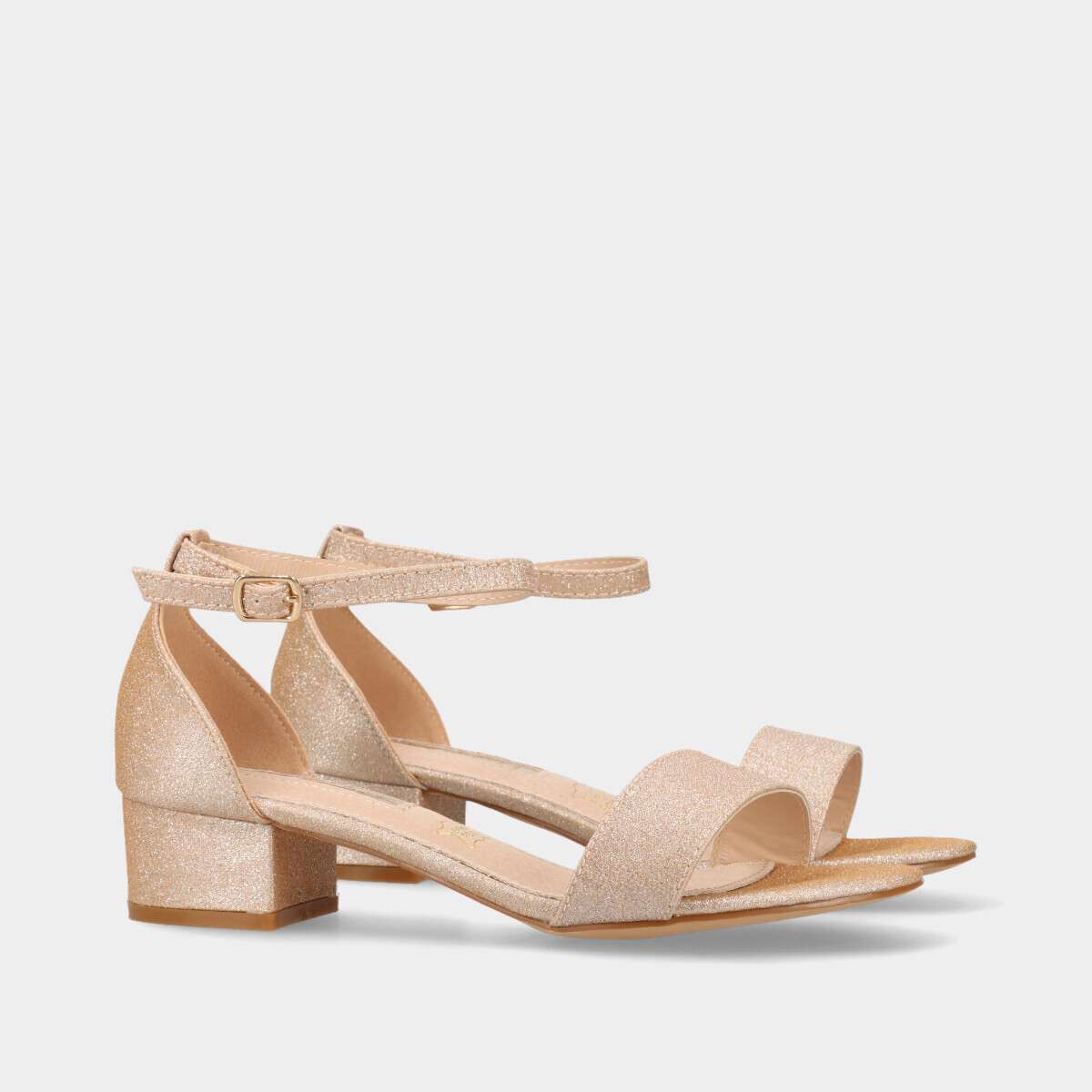 Sandália de festa confortável, em rosa dourado com glitter colorido, e fivela lateral para fácil ajuste.
