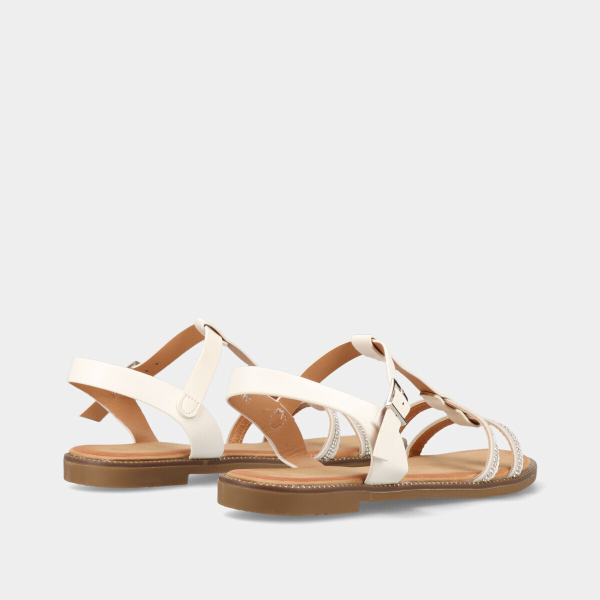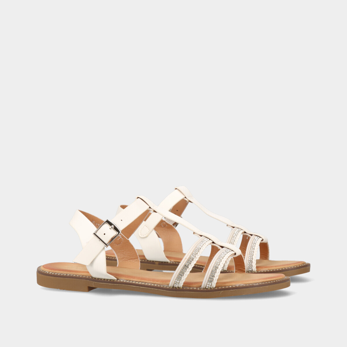 Sandália para mulher em branco, com brilhantes e fivela lateral ajustável.