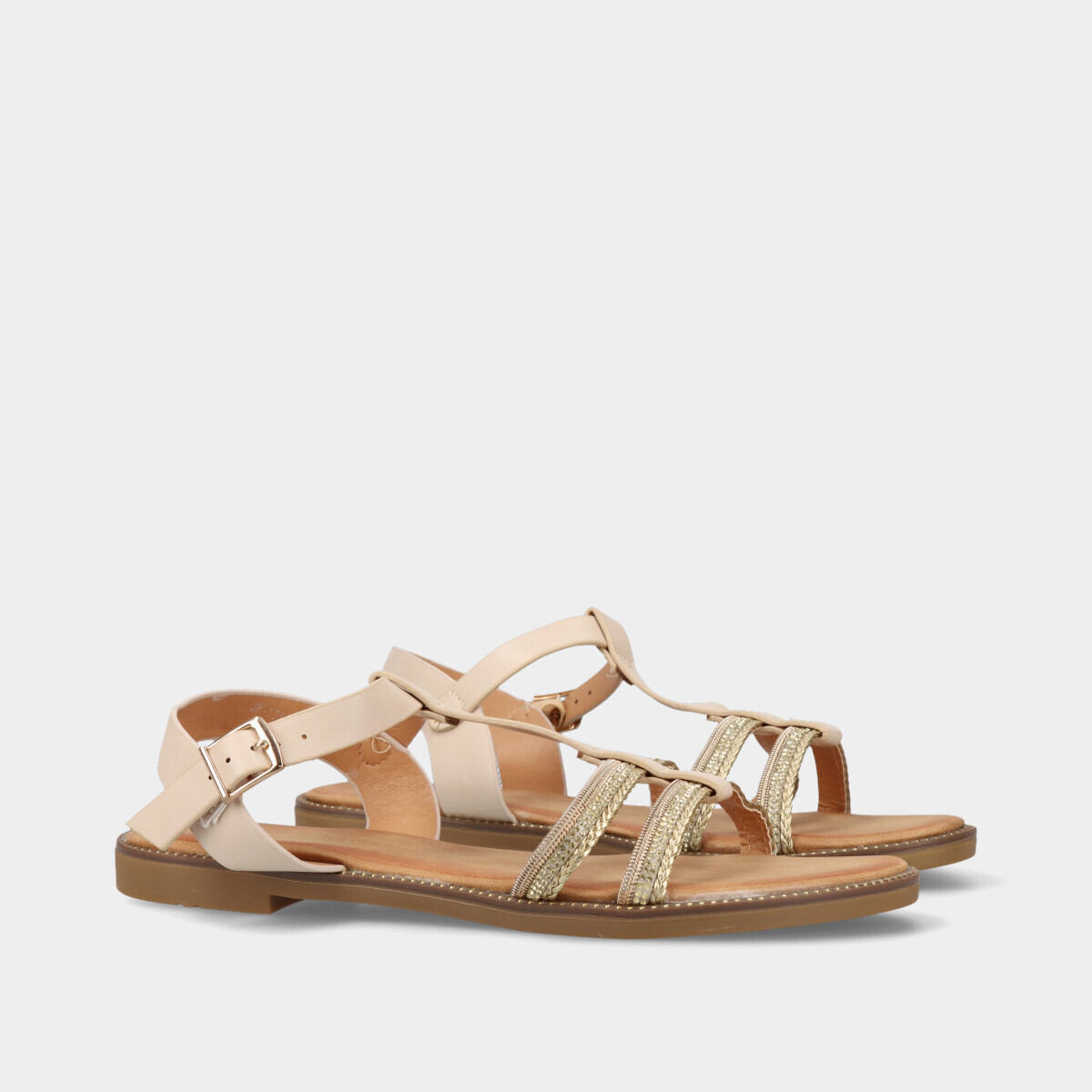 Sandália para mulher em bege, com brilhantes e fivela lateral ajustável.