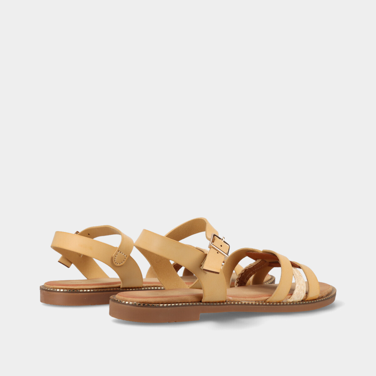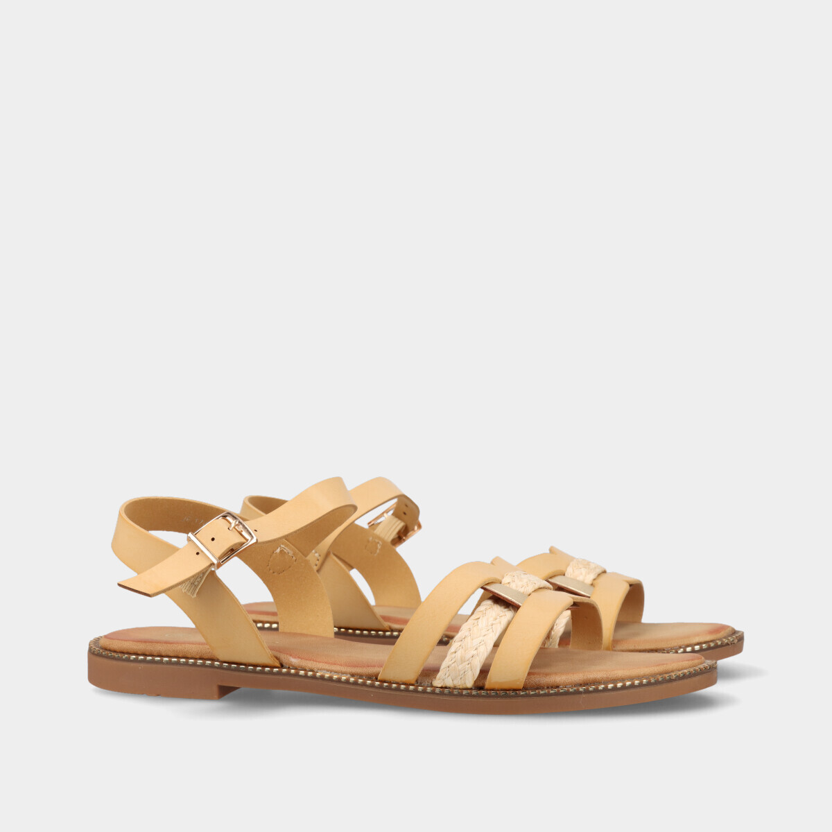 Sandália para mulher em bege, com fivela lateral ajustável.
