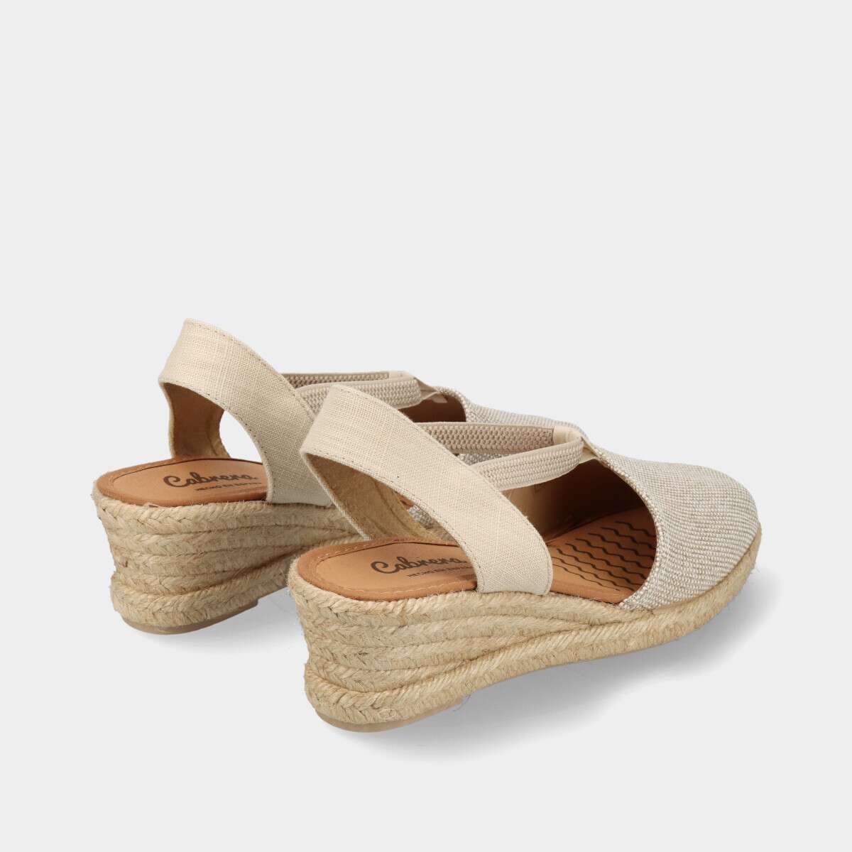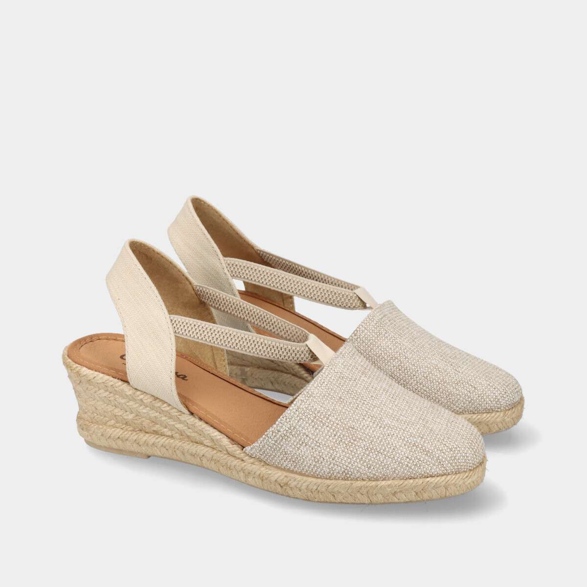 Sandálias de cunha beges com brilho prateado, tira elástica sobre o peito do pé, frente fechada e calcanhar aberto. Ideais para um look de verão elegante e natural.