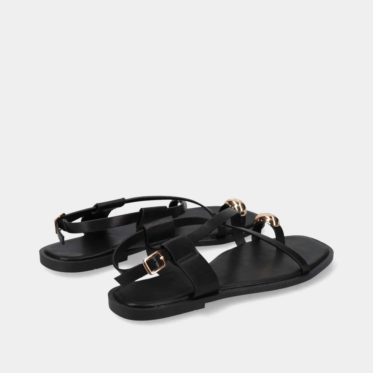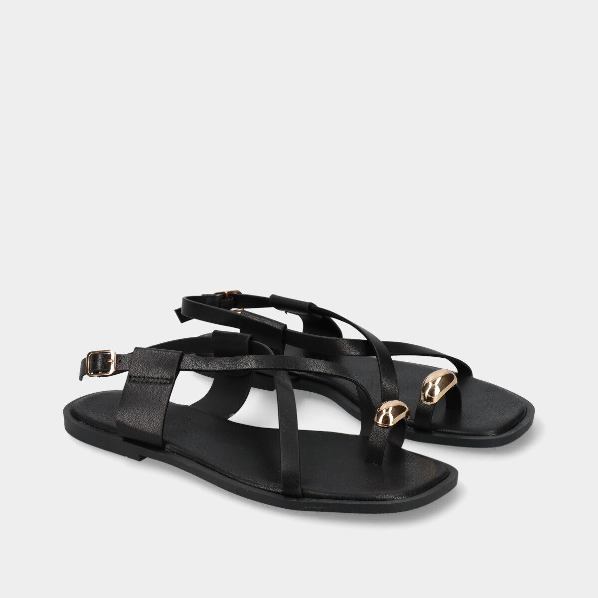 Sandálias de dedo pretas para mulher com aplicação dourada, tira cruzada no peito do pé com fivela ajustável e sola flexível. Modelo leve e confortável, ideal para o verão, combinando um estilo moderno, minimalista e elegante.