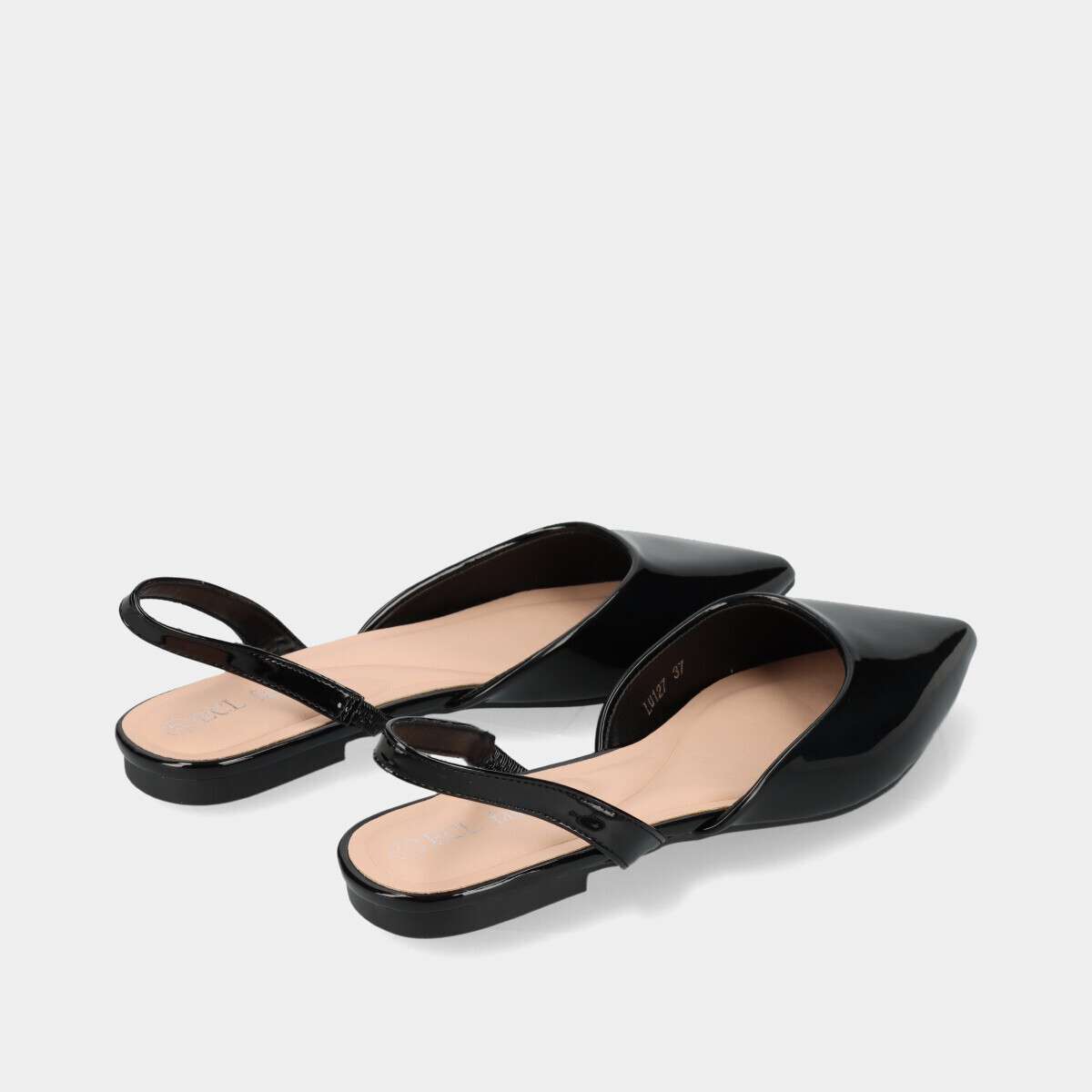 Mules em preto verniz, com elástico discreto na lateral interior.