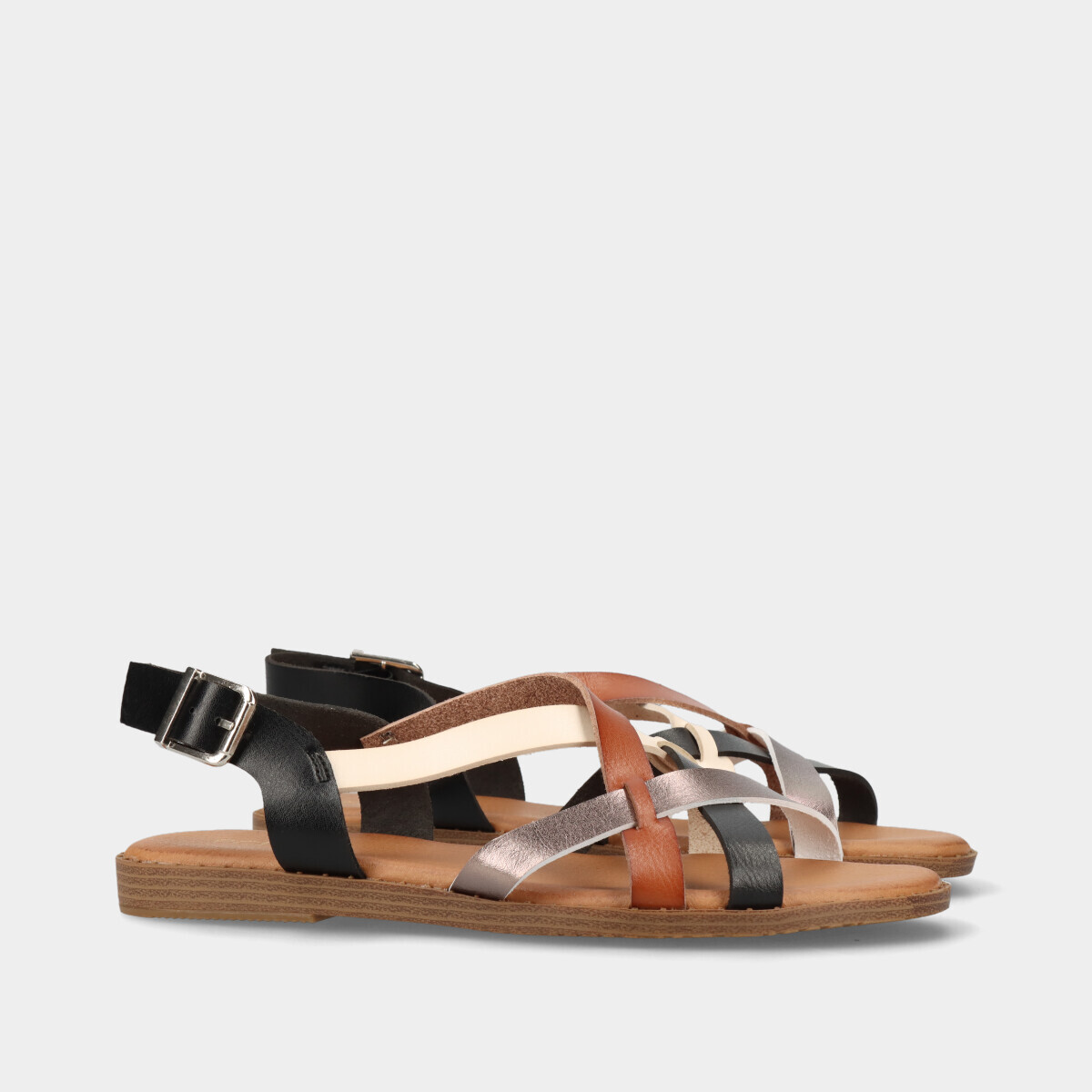 Sandália para mulher em preto, com fivela lateral ajustável.
