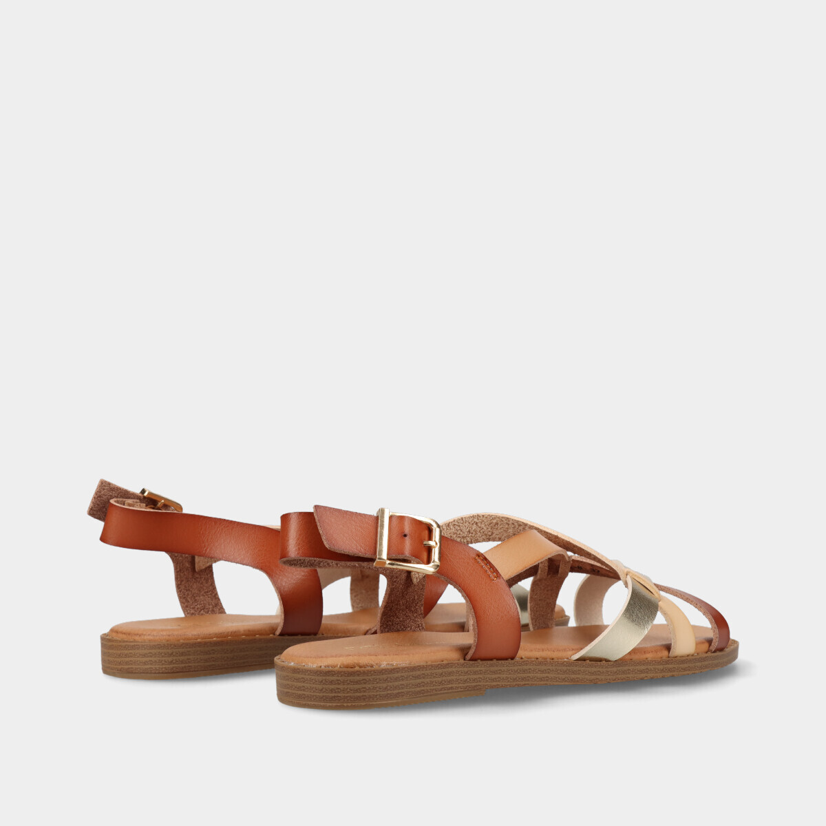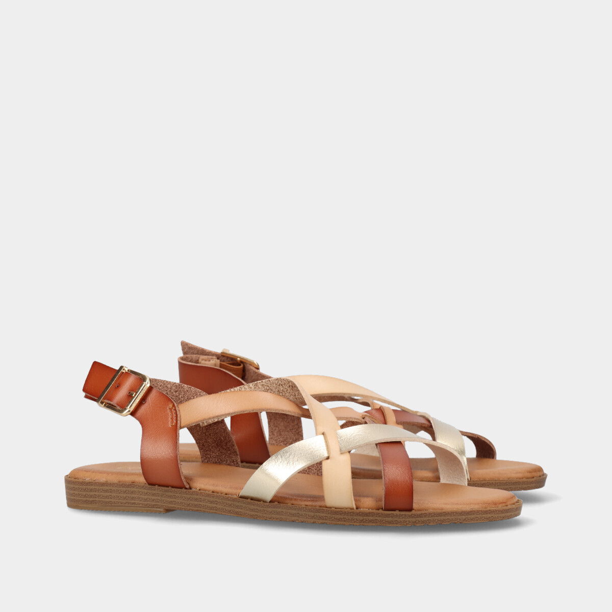Sandália para mulher em camel, com fivela lateral ajustável.