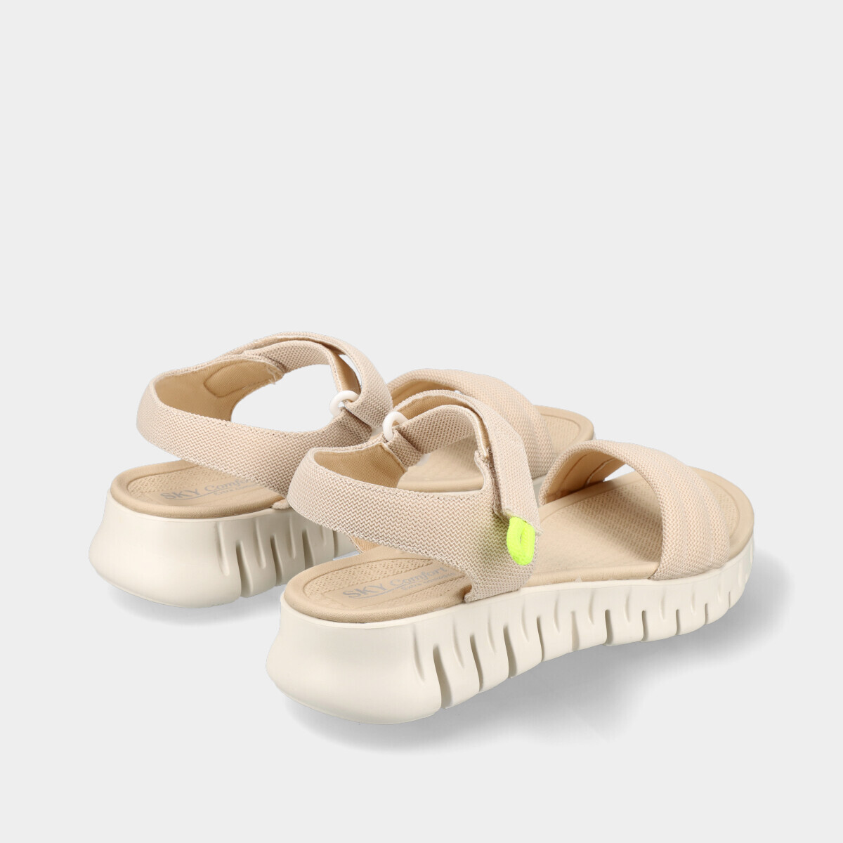 Sandálias bege para mulher que combinam conforto e flexibilidade com um design intemporal. A palmilha macia adapta-se ao pé, proporcionando uma sensação de leveza contínua, enquanto o fecho em velcro permite um ajuste preciso e confortável, ideal para o uso diário.
