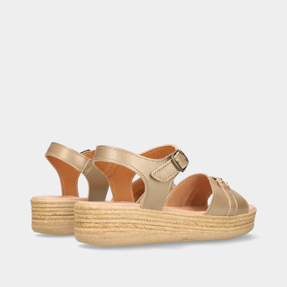 Esta sandália de cunha na cor dourada é a escolha ideal para um look elegante e confortável. Apresenta uma aplicação dourada na parte da frente que adiciona um toque de sofisticação. Perfeita para os dias de verão, combina facilmente com várias opções de vestuário, garantindo estilo e conforto em todas as ocasiões.