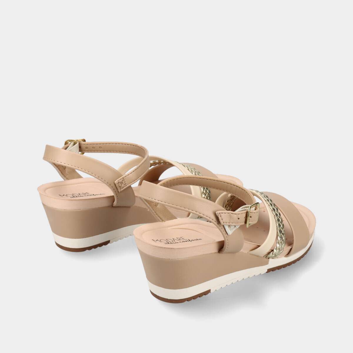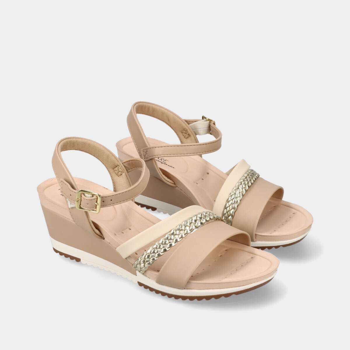 Sandália confortável com design casual em tons de bege e dourado, com fivela lateral.