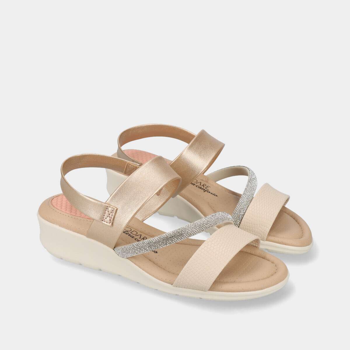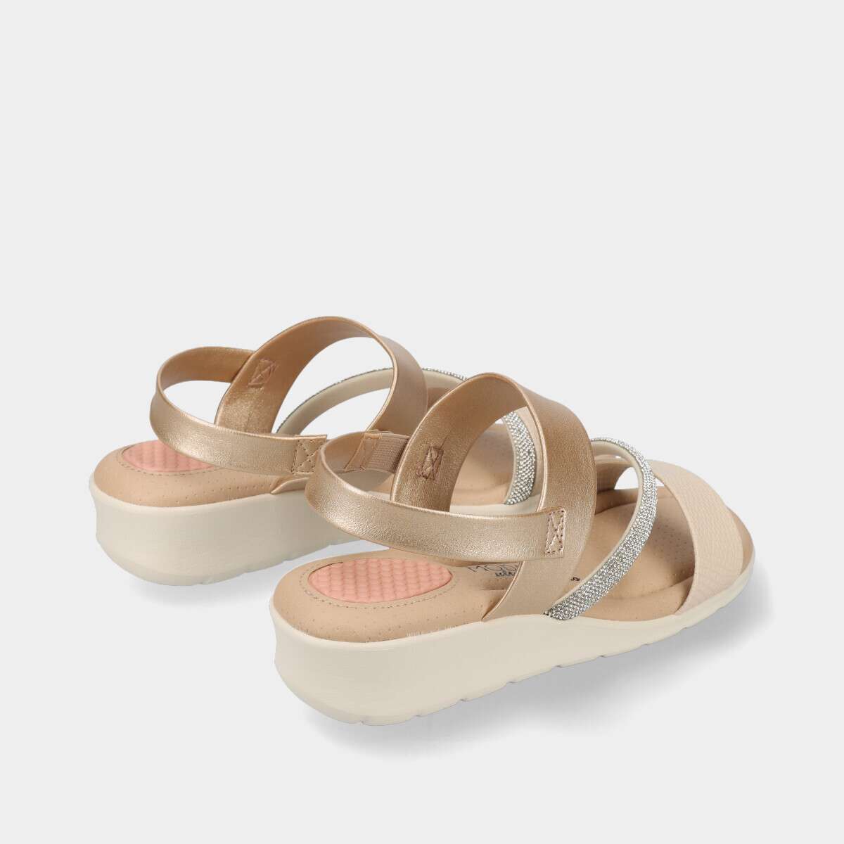 Sandália confortável em tons de bege e dourado brilhante, com tira sobre o peito do pé repleta de brilhantes prateados e elástico na parte interior para ajuste fácil.