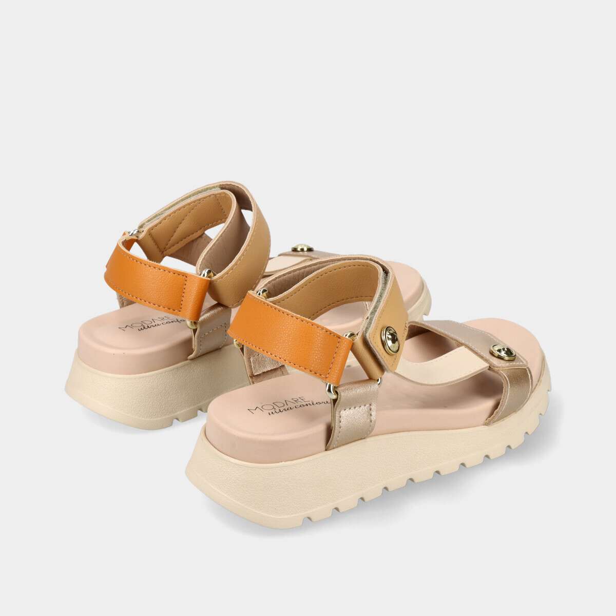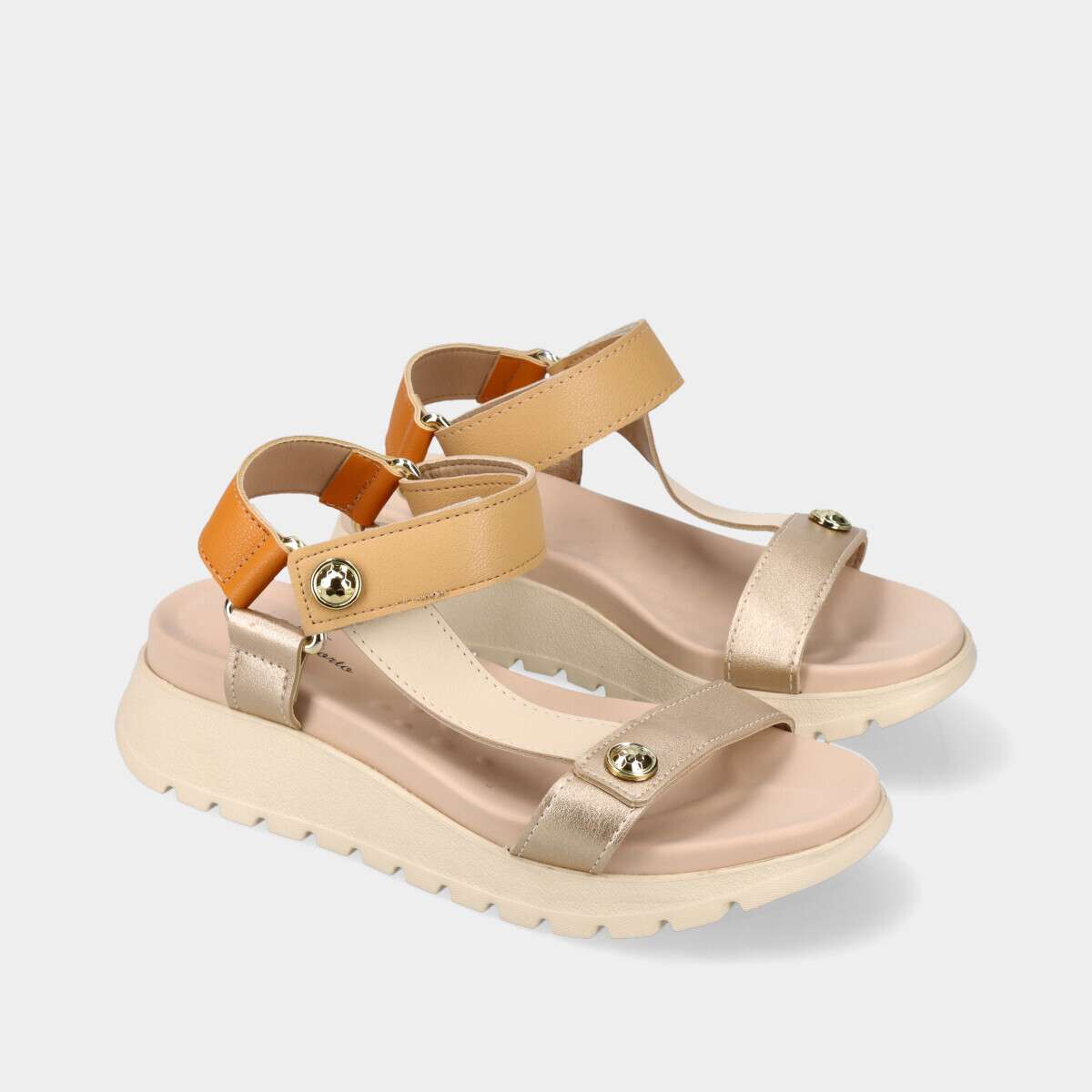 Sandália confortável com design casual em tons de bege e dourado brilhante, com velcro.