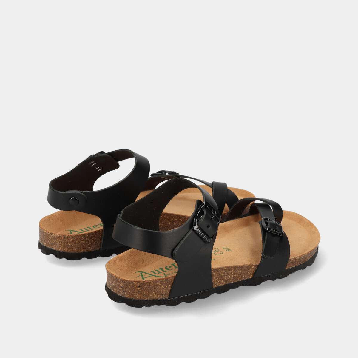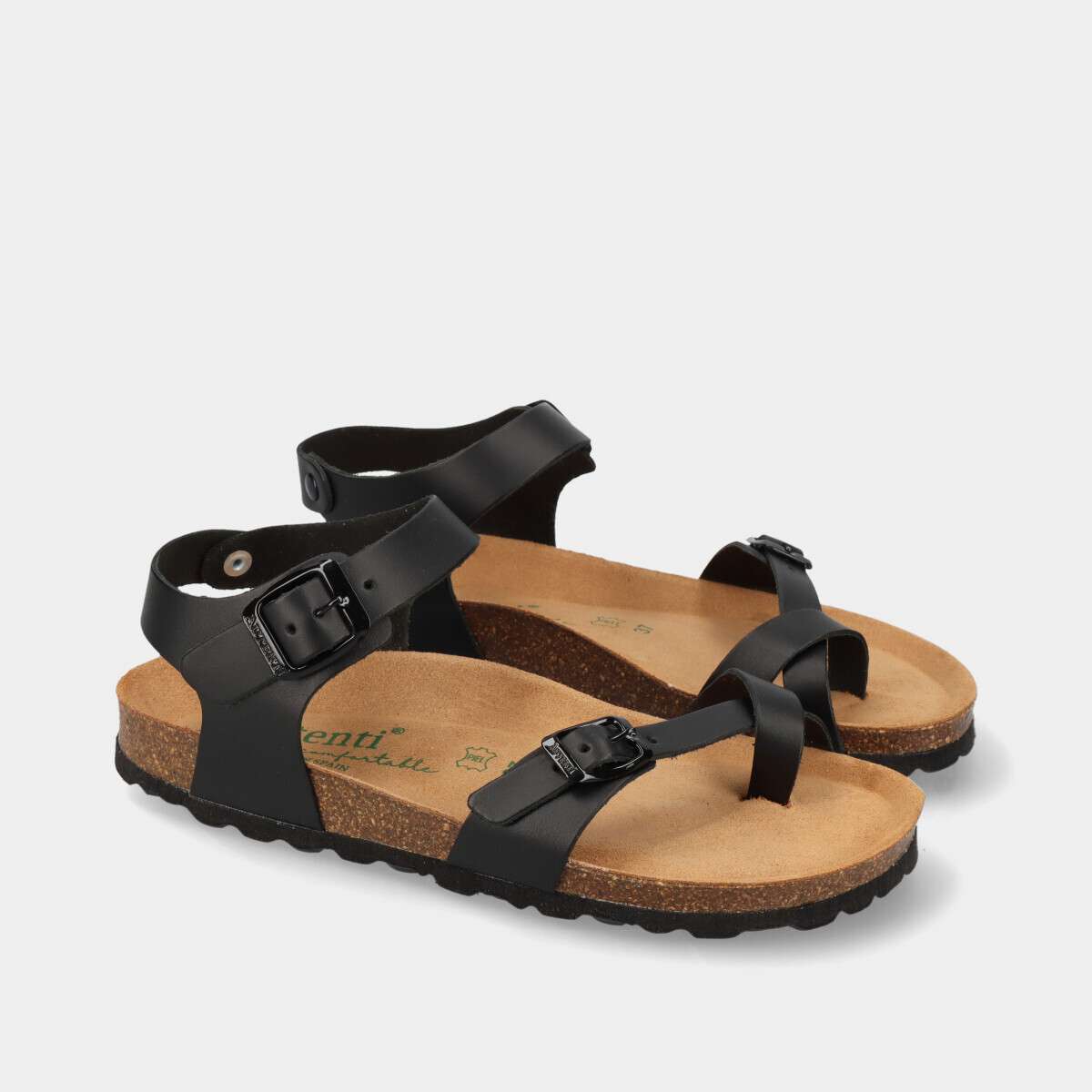 Sandália anatómica de dedo em pele para mulher, na cor preta, com palmilha em cortiça 100% natural e duas fivelas ajustáveis. Ideal para o dia a dia, combina estilo, conforto e durabilidade.