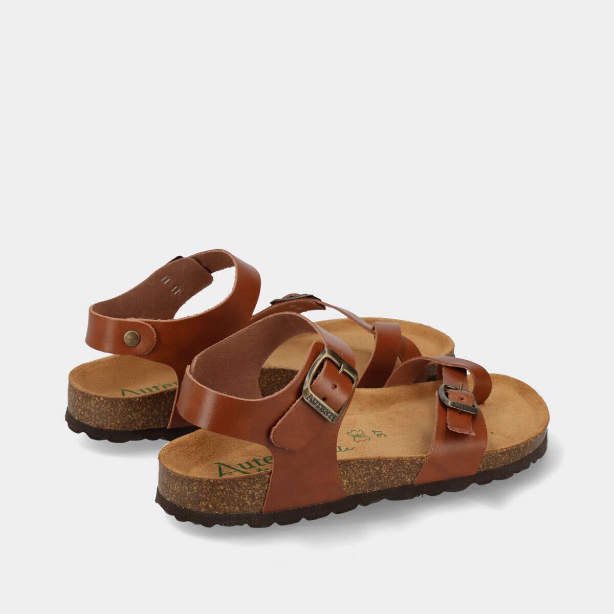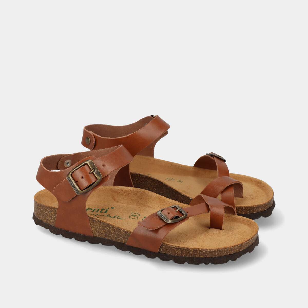 Sandália anatómica de dedo em pele para mulher, na cor castanha, com palmilha em cortiça 100% natural e duas fivelas ajustáveis. Ideal para o dia a dia, combina estilo, conforto e durabilidade.