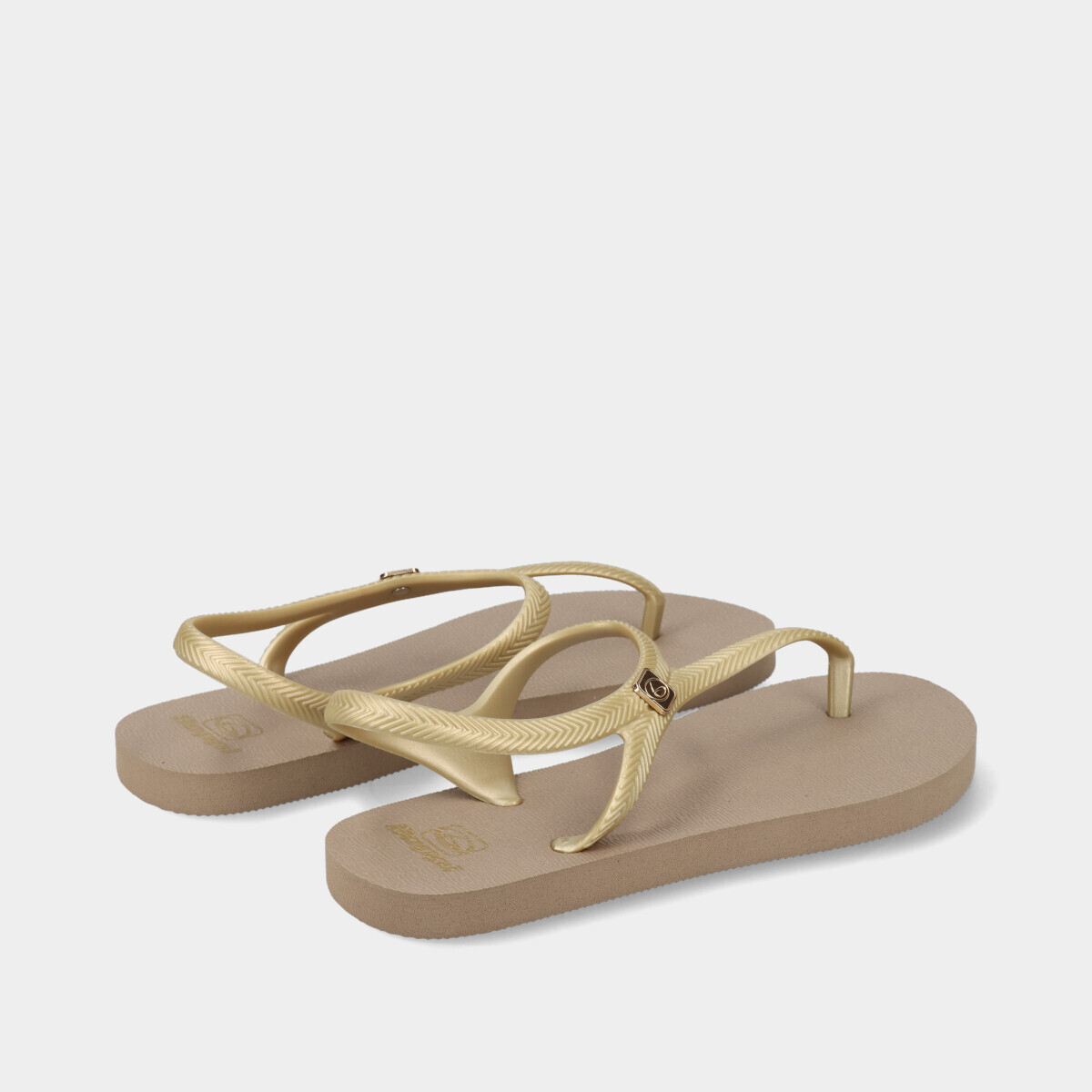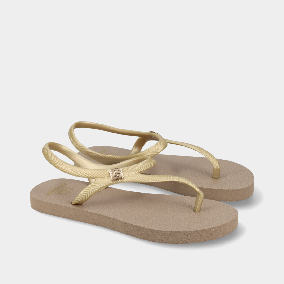Sandália rasa para mulher em taupe com tiras douradas. Combina o conforto dos chinelos com a estabilidade de uma sandália graças à tira de fixação no tornozelo. Leve, prática e antiderrapante, ideal para o verão, praia, piscina ou uso diário.