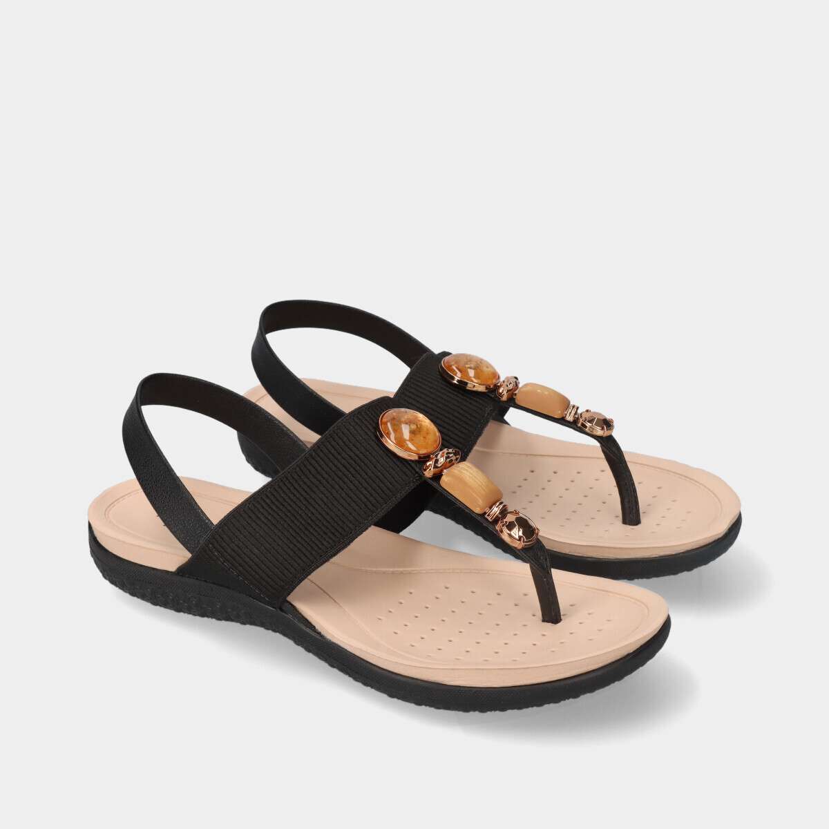 Sandália de mulher na cor preta com aplicações no peito do pé. Bastante confortáveis e práticas!