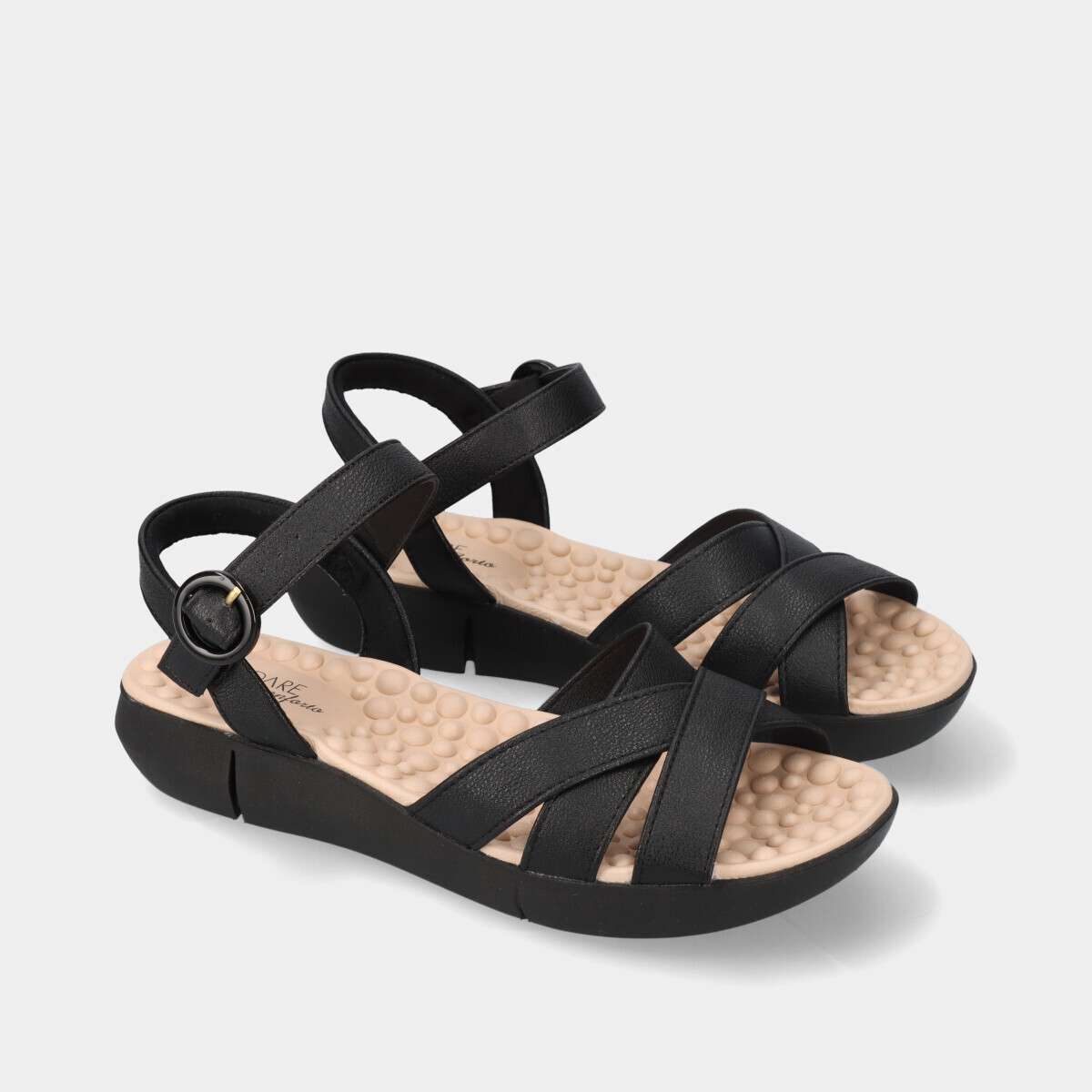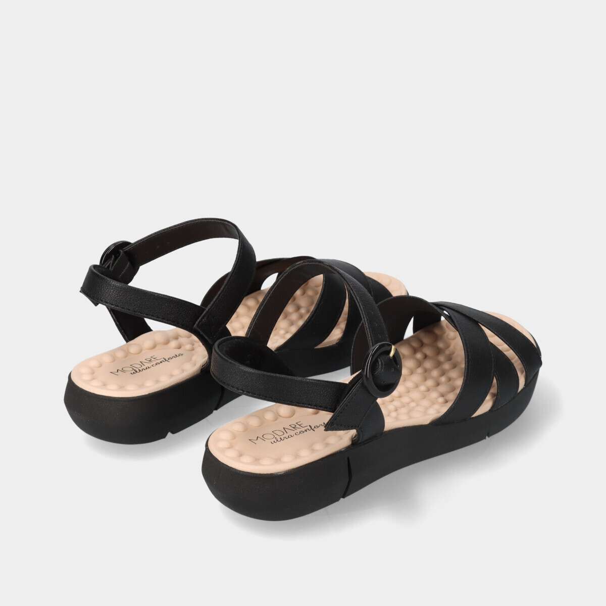 Sandália confortável de mulher na cor preta, com tiras cruzadas e fivela para fácil ajuste. Pamilha Reflex Sence em EVA ultramacio, possui esferas que massajam os pés, ativando a circulação sanguínea.