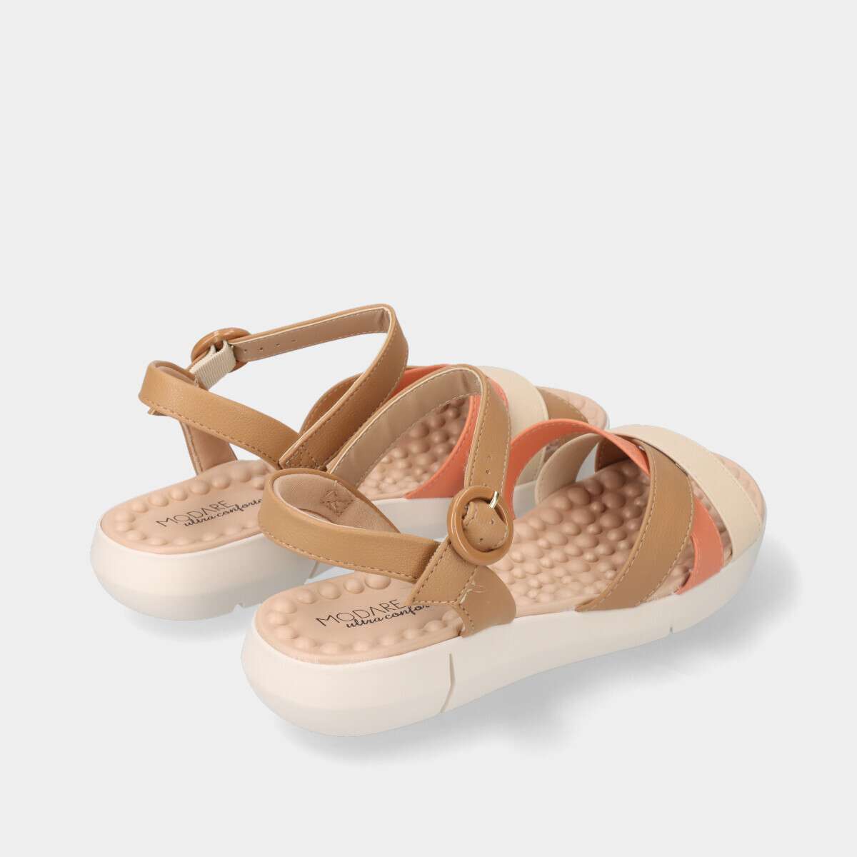 Sandália confortável de mulher na versão multicolorida entre os tons de camel, bege e salmão. Com tiras cruzadas e fivela para fácil ajuste.