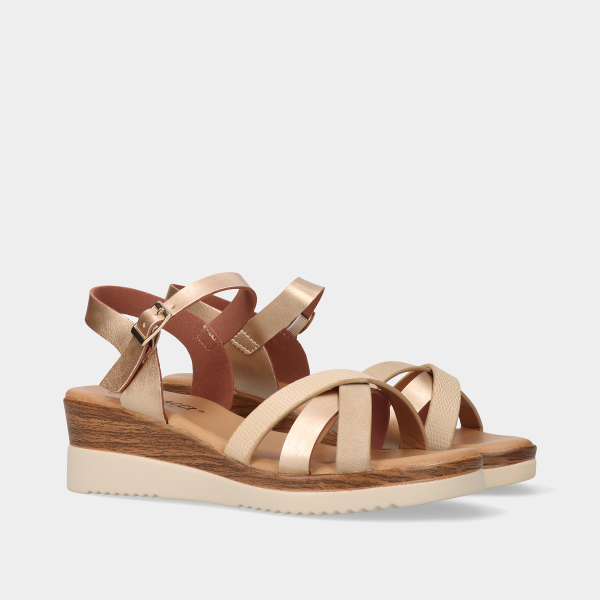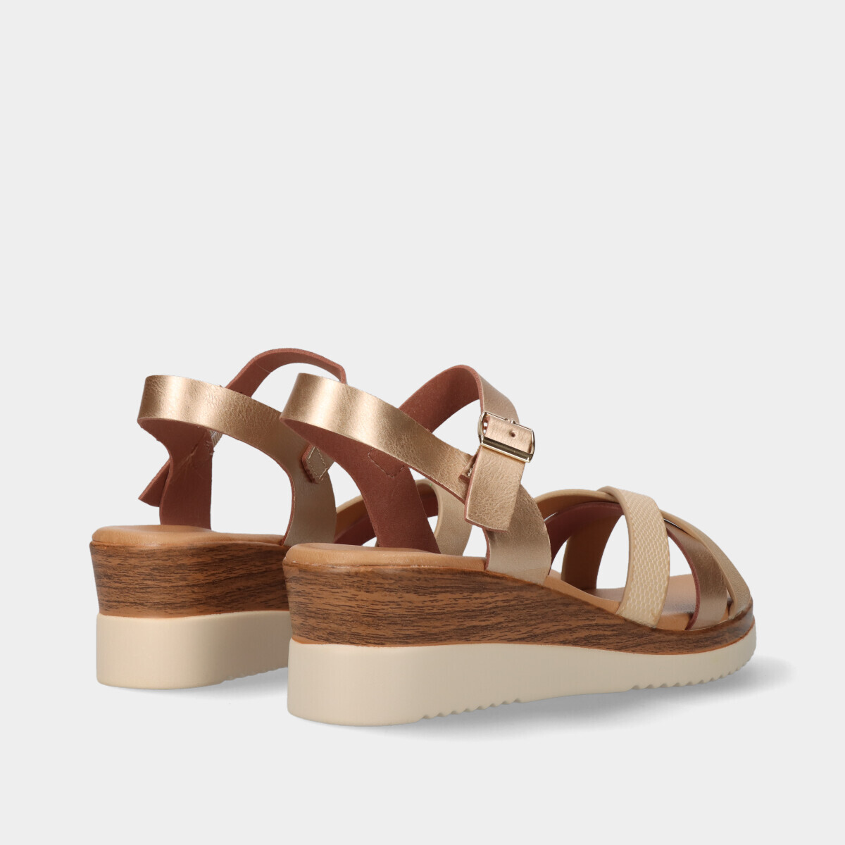 Sandália de cunha elegante na cor dourada, com tiras cruzadas que combinam materiais e texturas diversas, incluindo detalhes metalizados! Possui ajuste de fivela no tornozelo e uma confortável sola de cunha com efeito de madeira. Ideal para um look sofisticado e confortável, seguindo as tendências da estação.