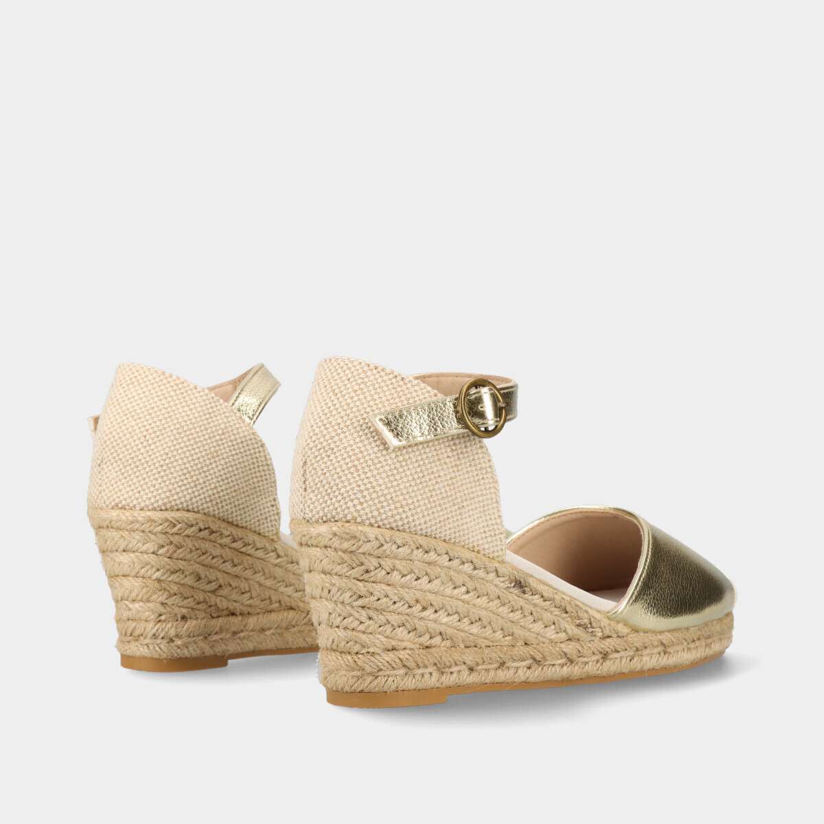 Sandálias de cunha douradas, com frente e calcanhar fechados e fivela na lateral. Ideais para um look de verão elegante e natural.