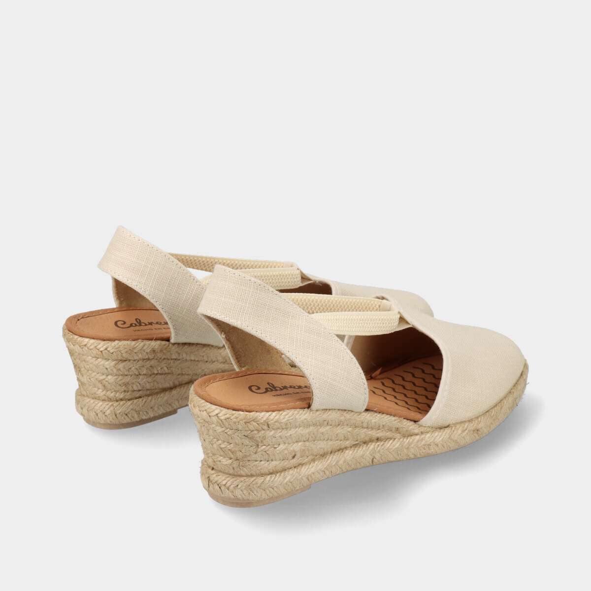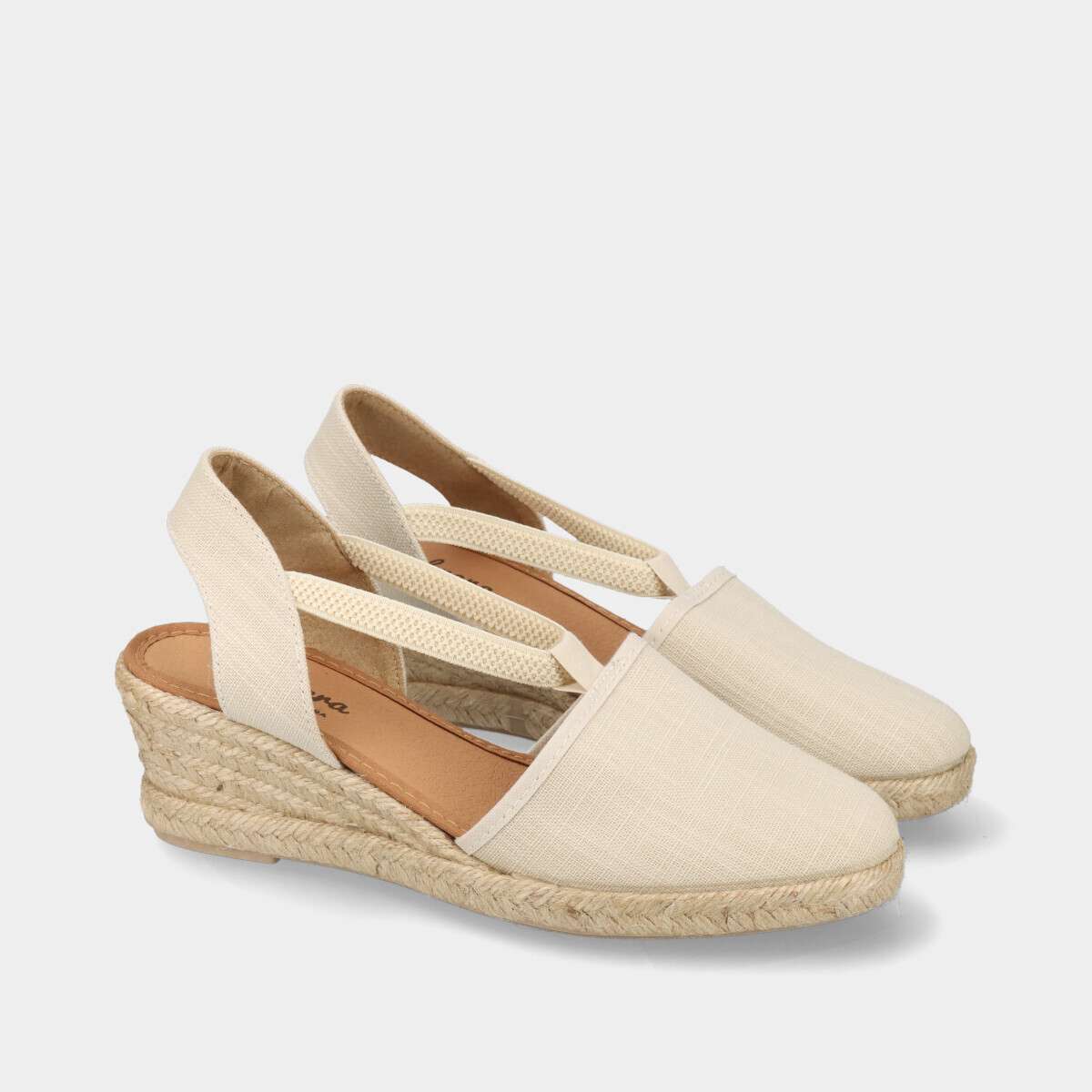 Alpercata para mulher com cunha baixa em corda de 5 cm, tira de elástico sobre o peito do pé e palmilha confortável.