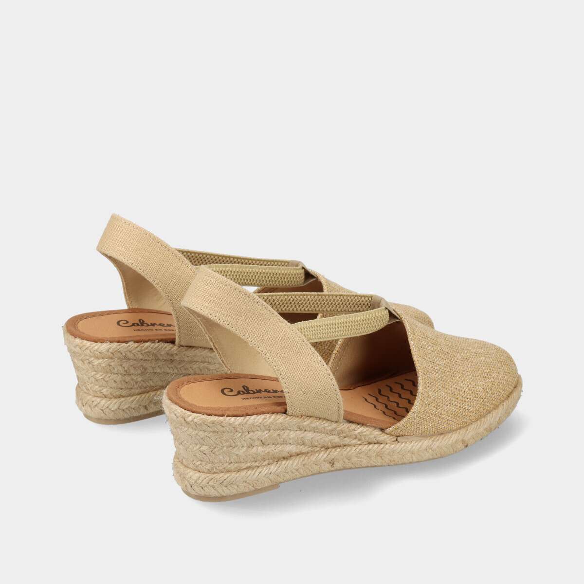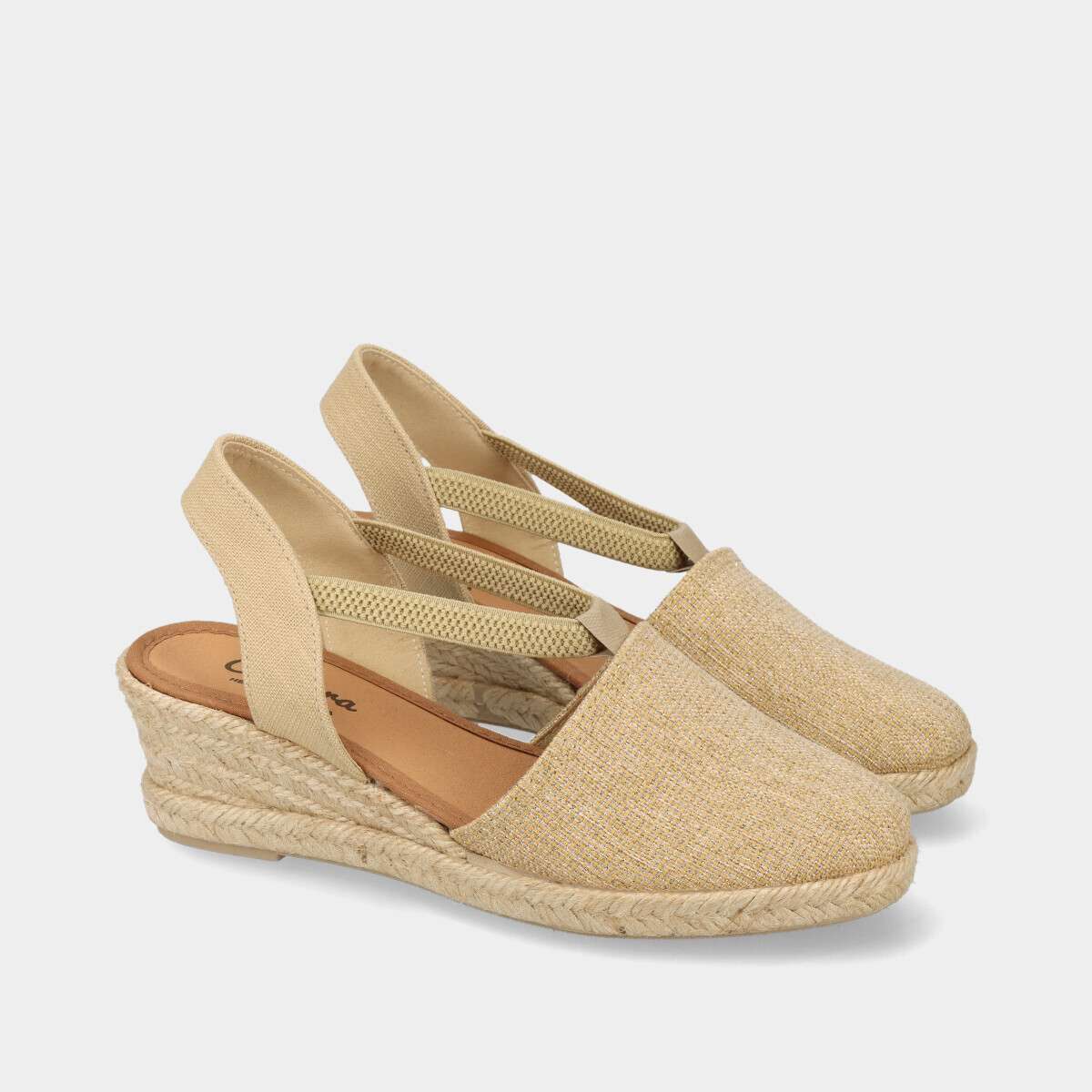 Sandálias de cunha douradas com brilho, tira elástica sobre o peito do pé, frente fechada e calcanhar aberto. Ideais para um look de verão elegante e natural.
