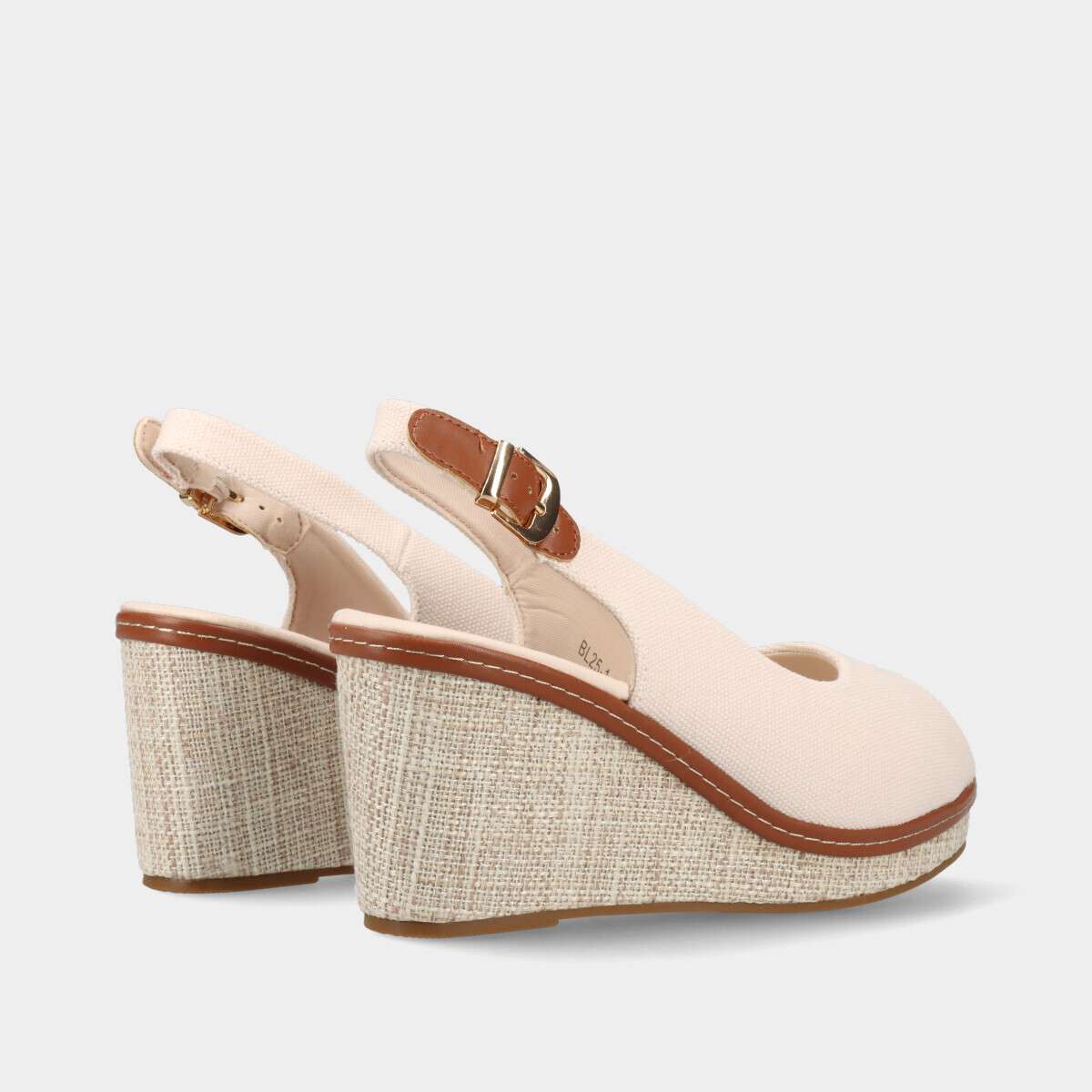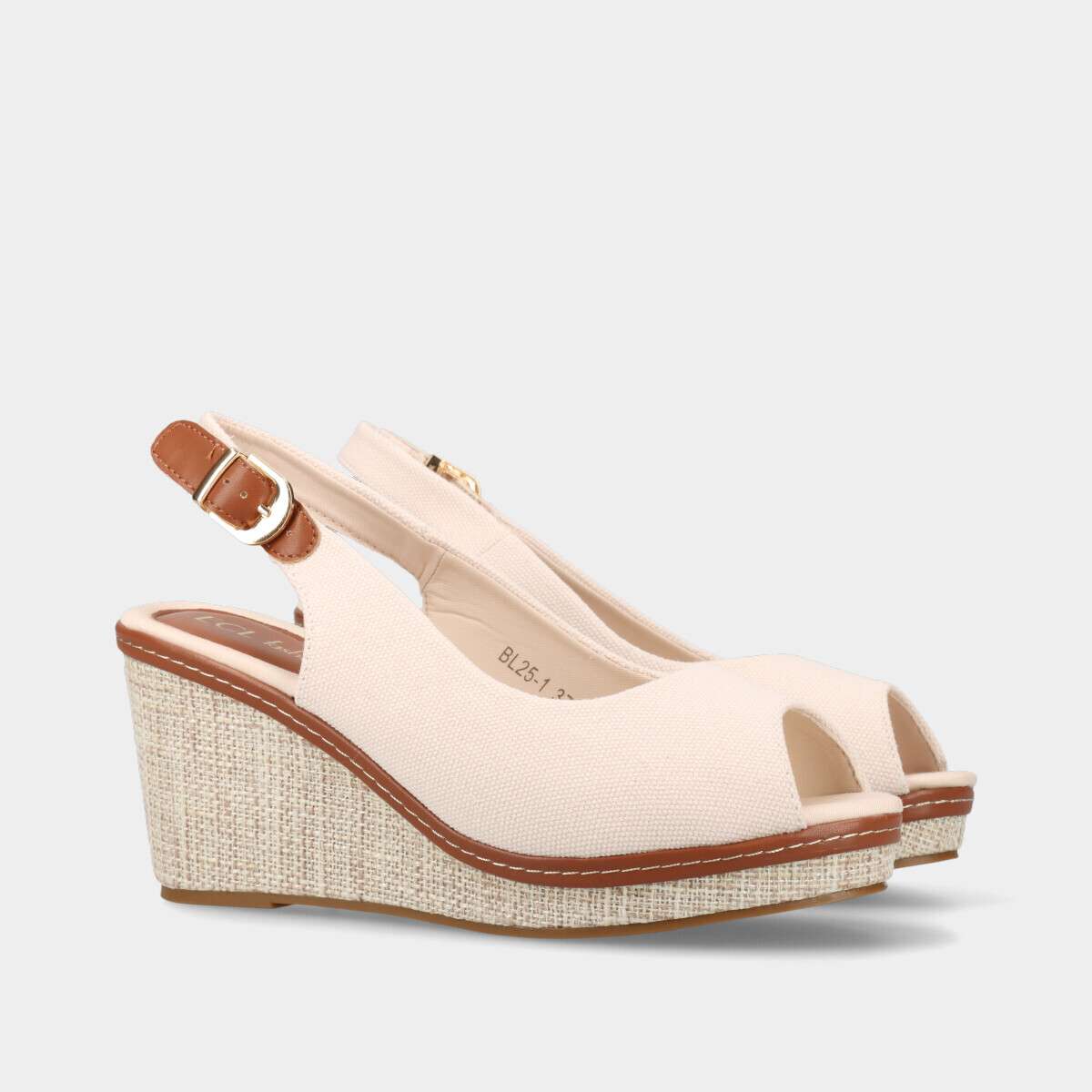 Sandália de cunha confortável, estilo peep toe em tecido bege com fivela ajustável.
