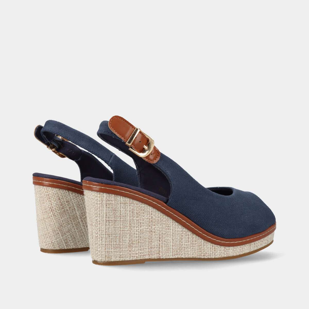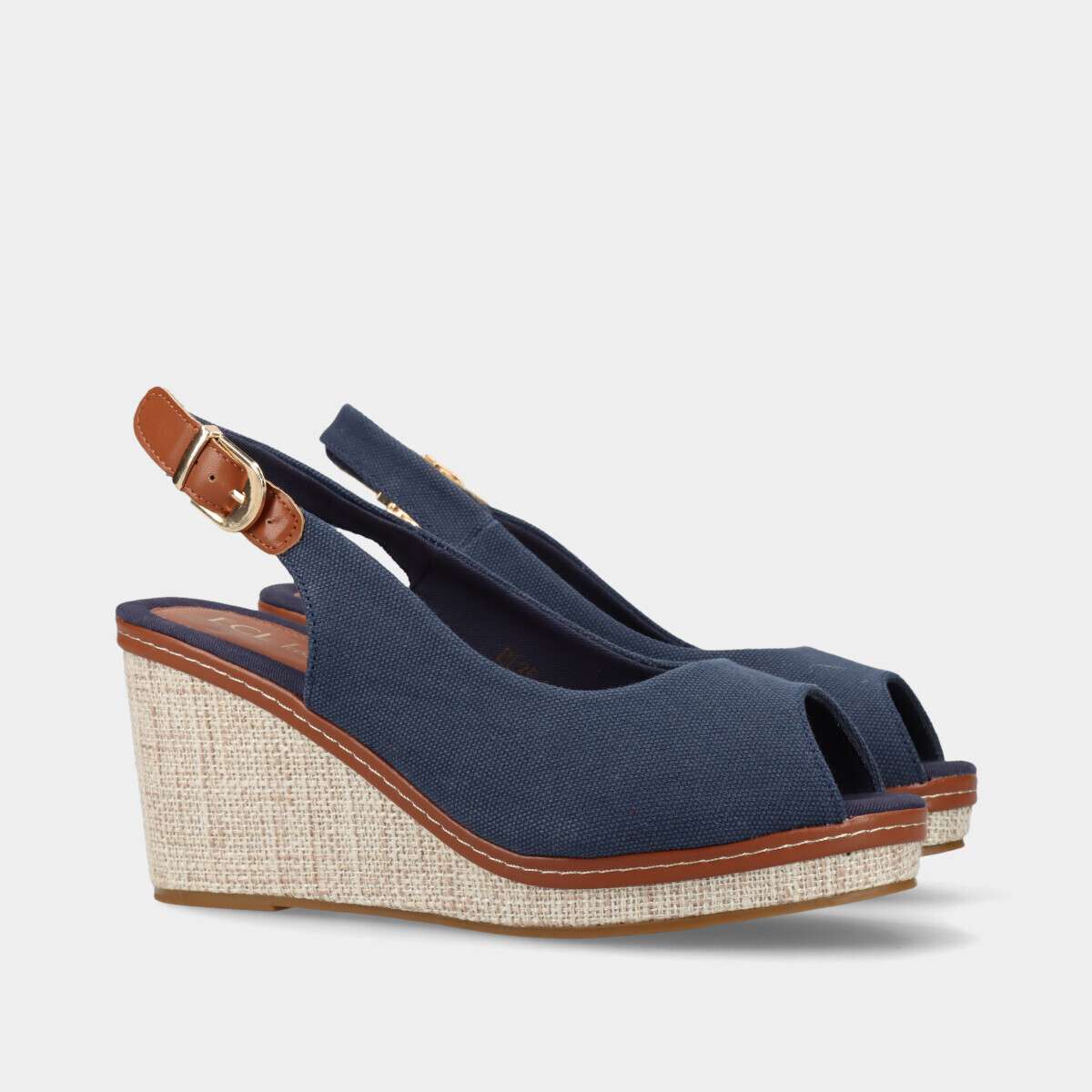 Sandália de cunha confortável, estilo peep toe em tecido azul com fivela ajustável.