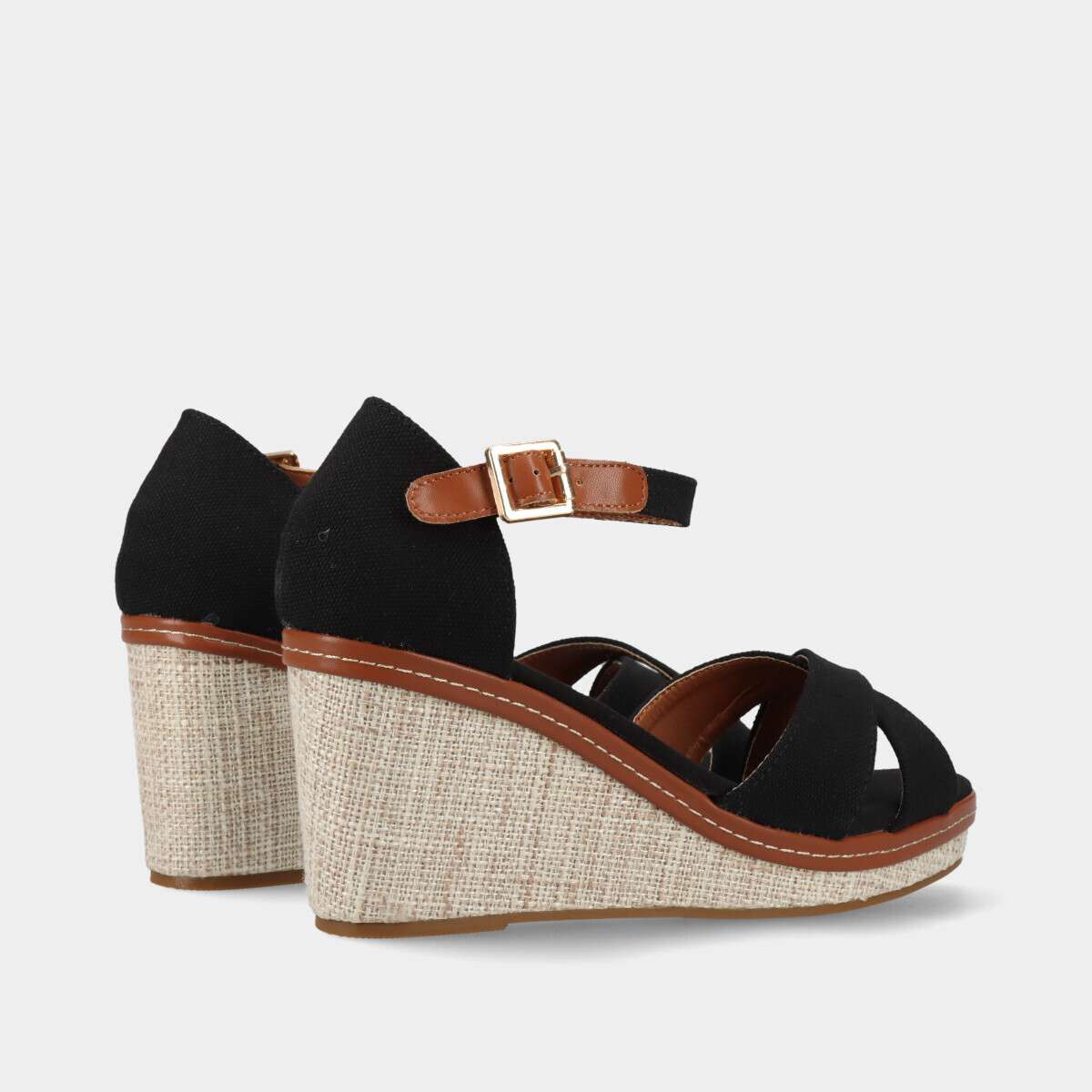 Sandália de cunha confortável, estilo peep toe em tecido preto com fivela ajustável.