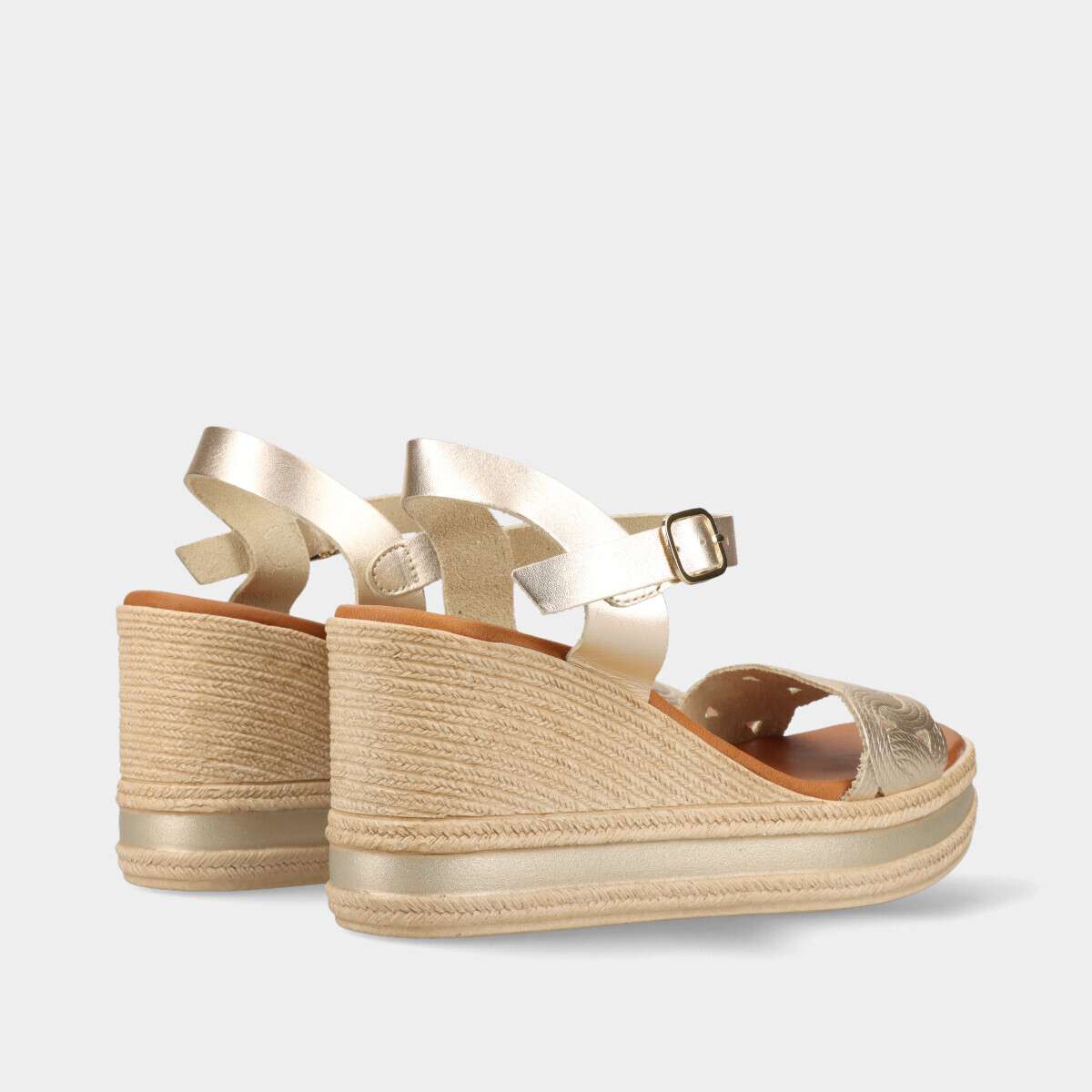 Sandálias de cunha em pele platina com fivela ajustável e palmilha de espuma muito confortável, ideais para um look de verão elegante.