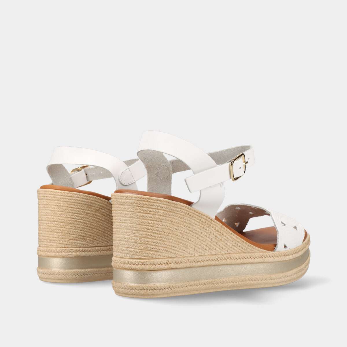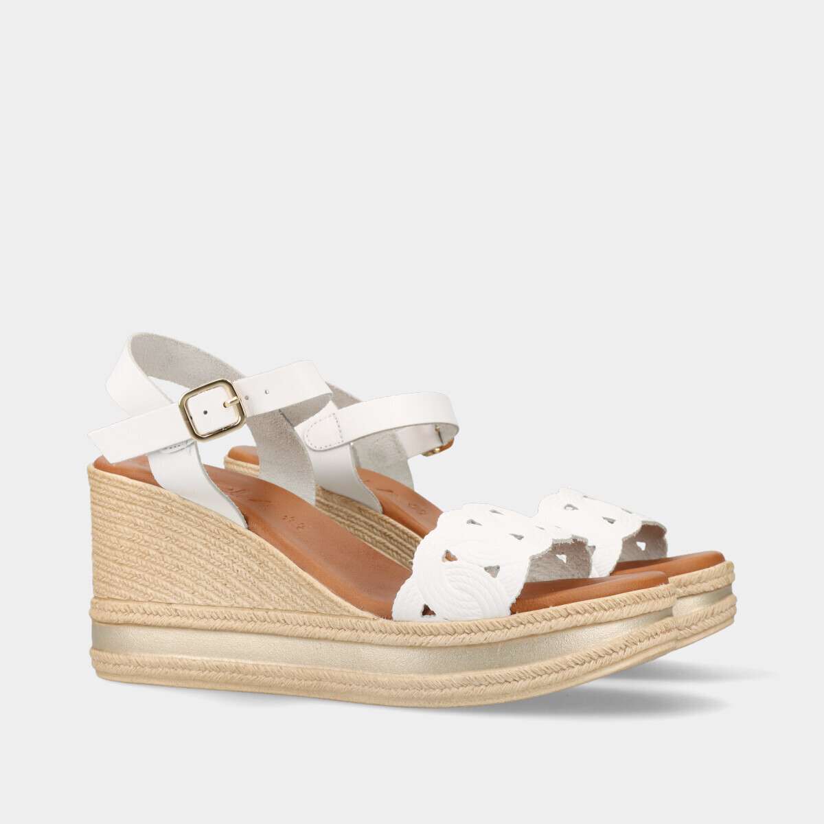 Sandálias de cunha em pele branca com fivela ajustável e palmilha de espuma muito confortável, ideais para um look de verão elegante.
