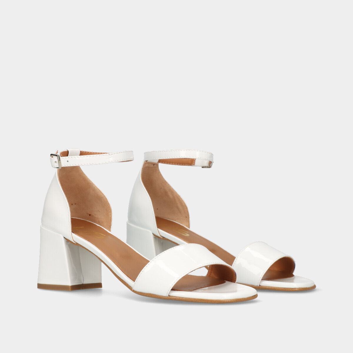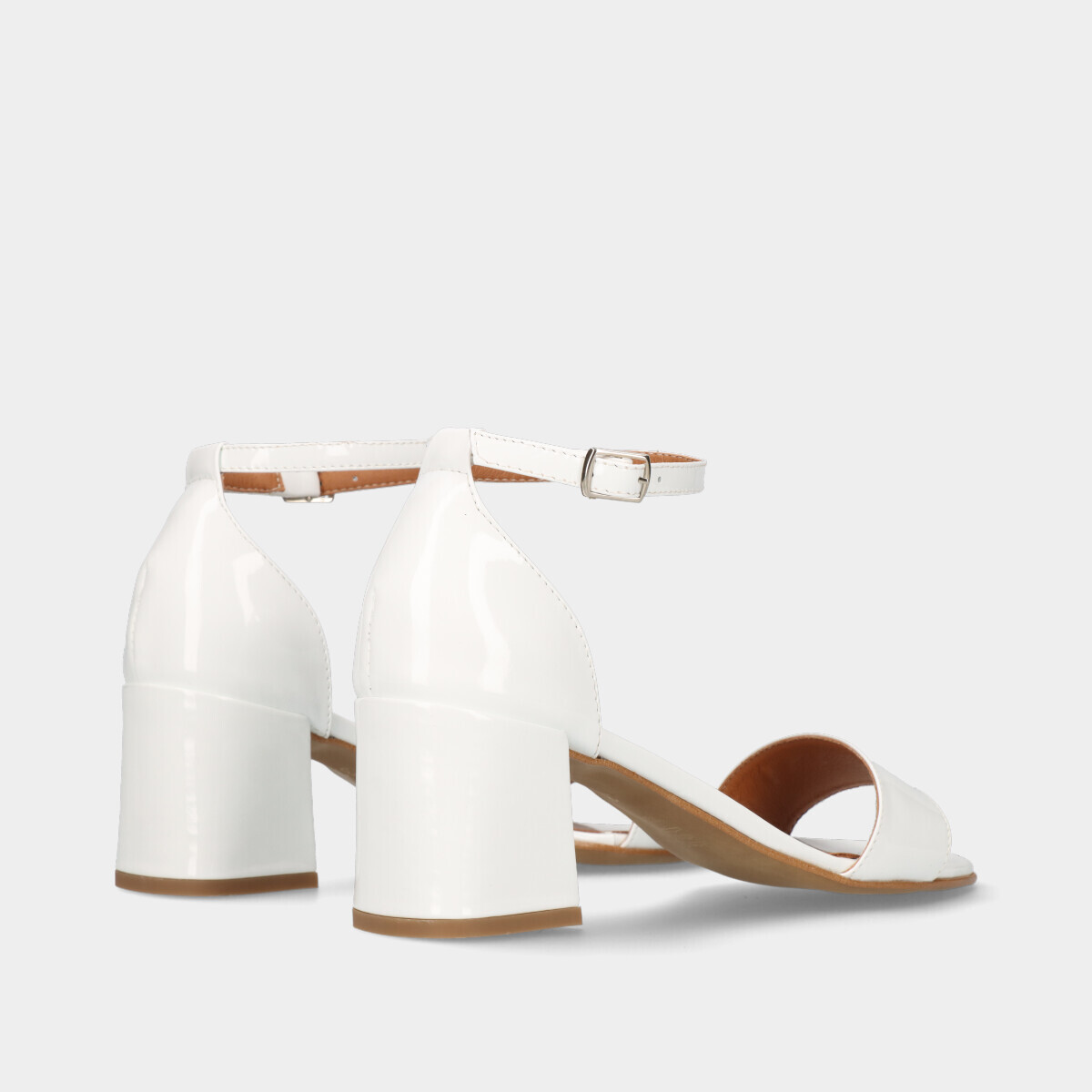 Descubra a elegância atemporal com a nossa sandália de salto composta por pele verniz em branco!