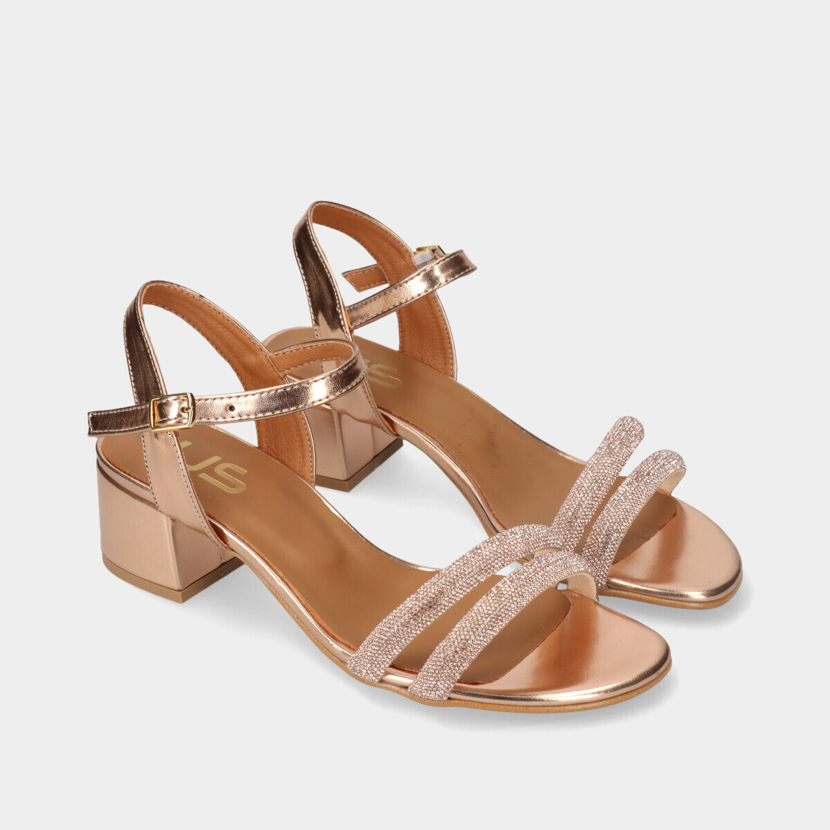Apresentamos a nossa deslumbrante sandália de salto em pele, com tiras adornadas com cristais, em rosa dourado! Esta sandália combina moda e conforto, garantindo que cada passo seja uma experiência elegante e sem esforço.
