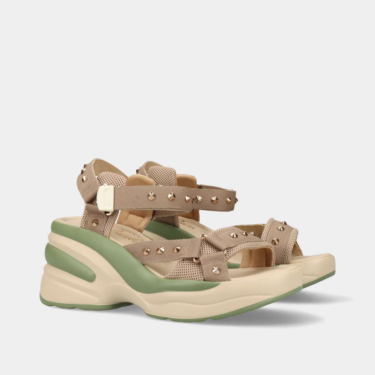 Sandália feminina cheia de personalidade na cor taupe, com sola alta bicolor em bege e verde e fecho de velcro para um ajuste prático.