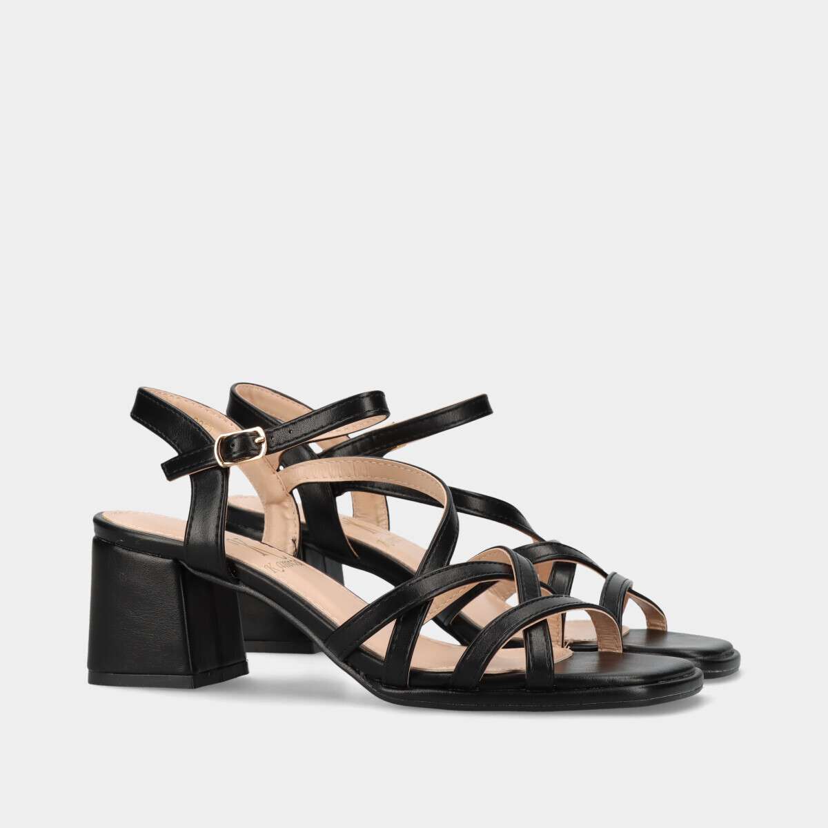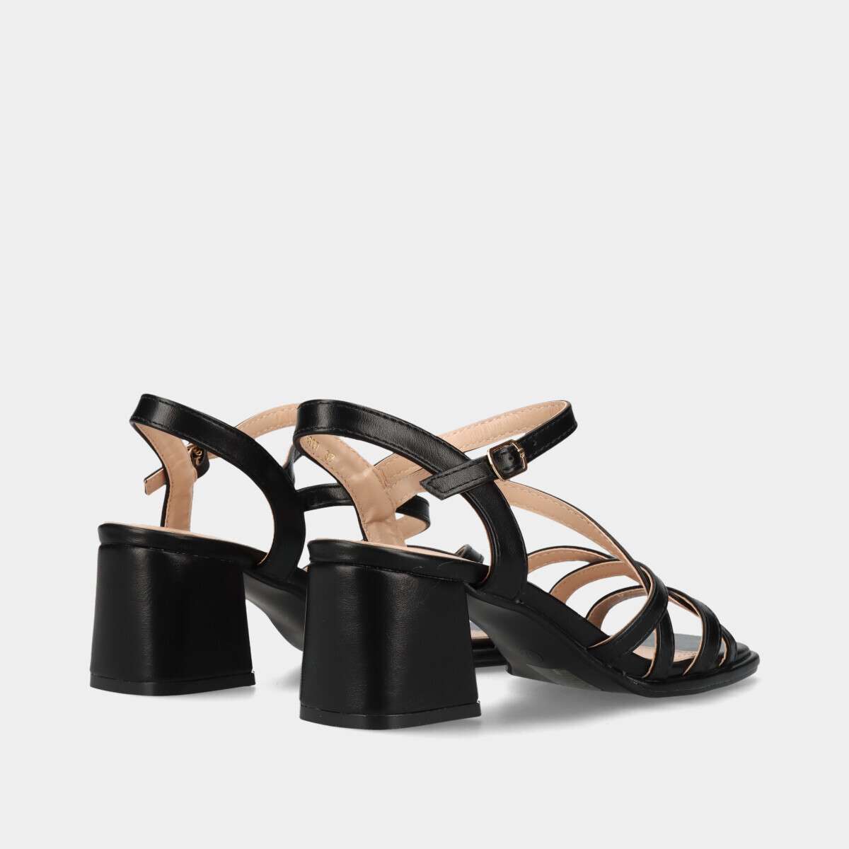 Sandália de festa com salto estável e confortável na cor preta, com fivela lateral para fácil ajuste.
