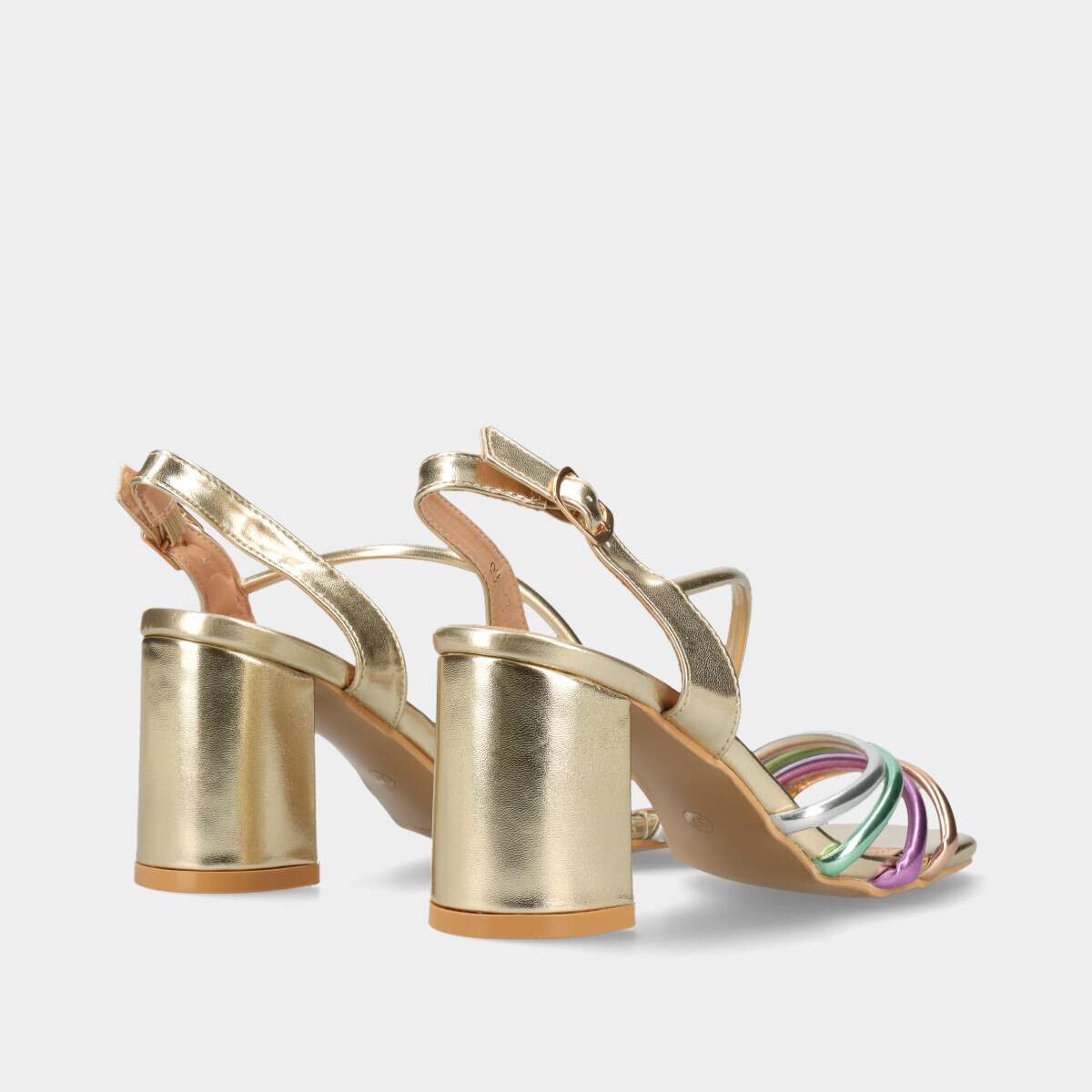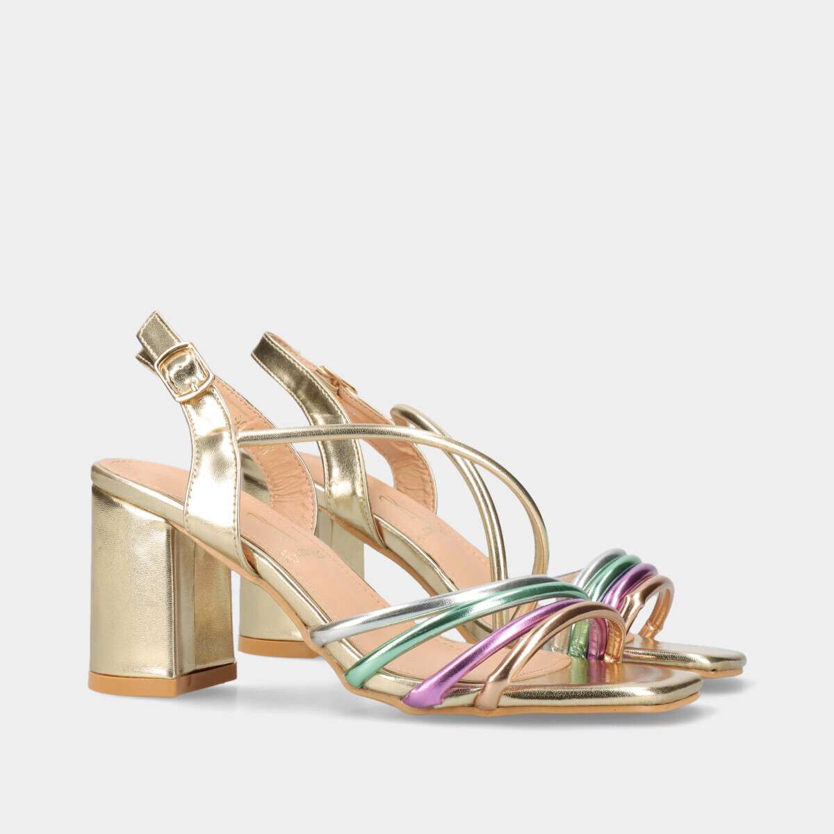 Sandália de festa com salto estável e confortável na cor dourada e tiras coloridas, com fivela lateral para fácil ajuste.
