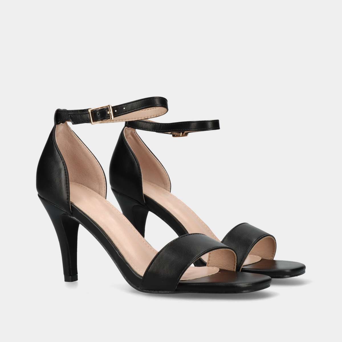 Sandália de festa em preto com salto fino e fivela lateral para um ajuste perfeito.