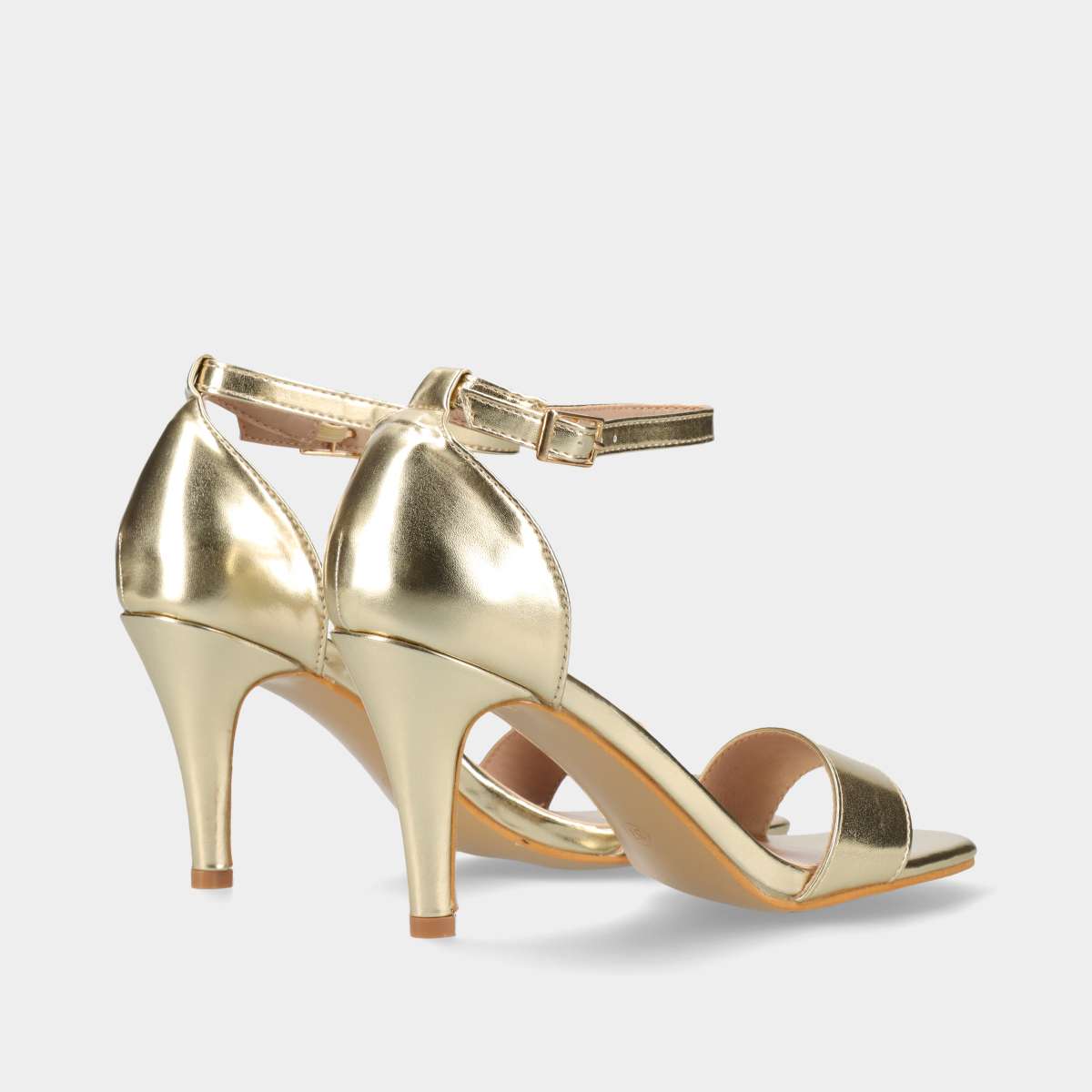Sandália de festa em dourado com salto fino e fivela lateral para um ajuste perfeito.