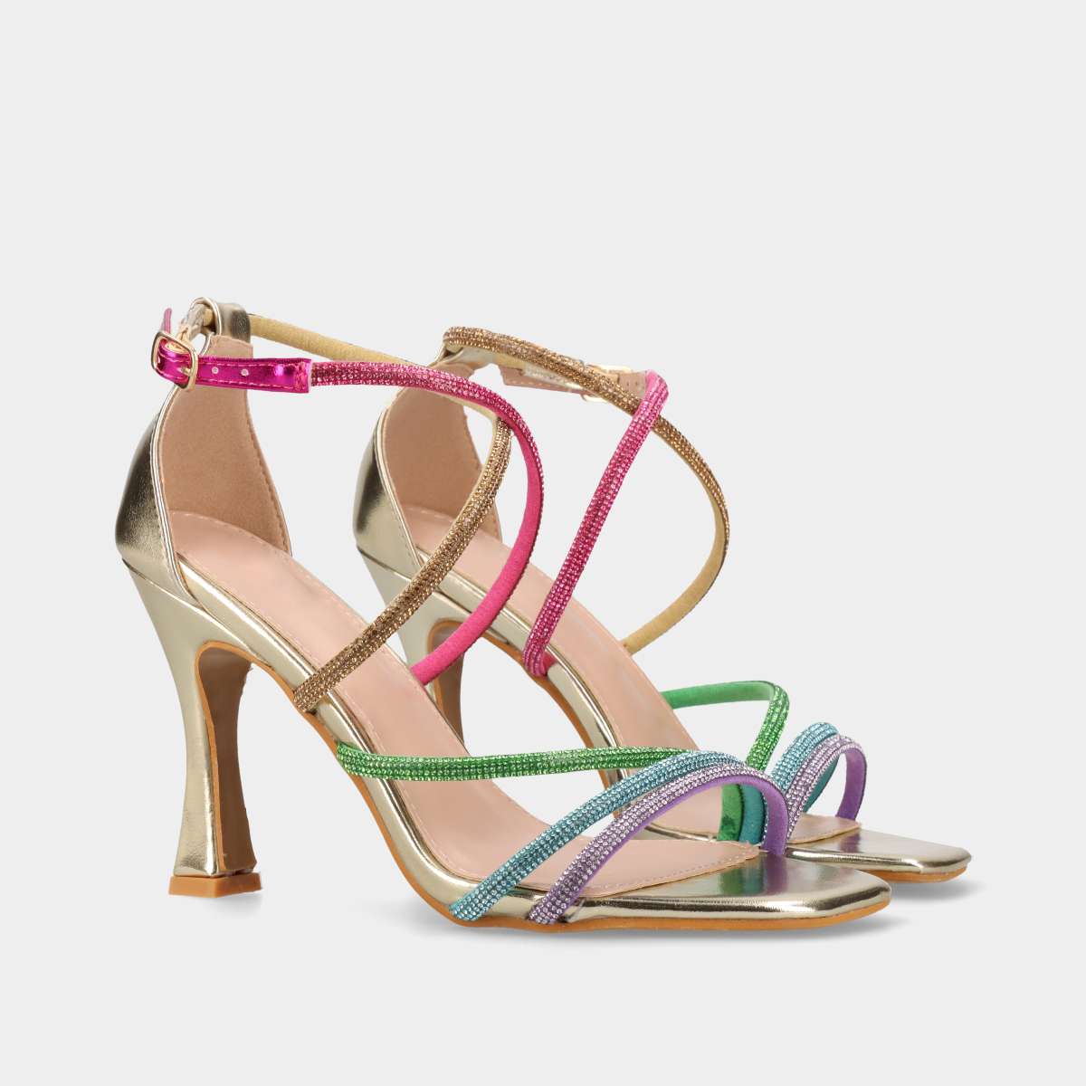 Sandália de festa em dourado com tiras coloridas de cristais, salto fino e fivela lateral para um ajuste perfeito.