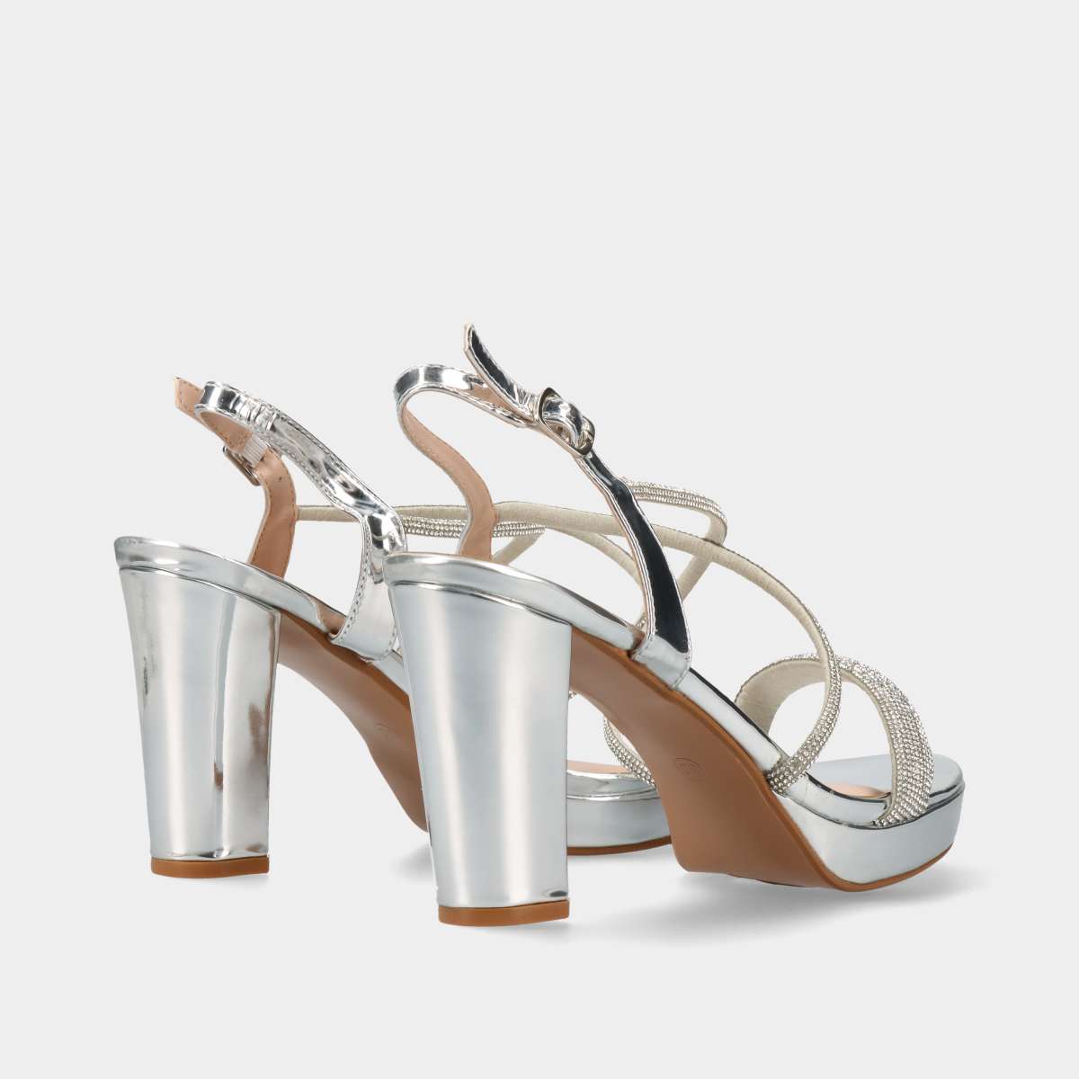 Sandália de salto com compensado à frente, na cor prateada com tiras de cristais e fivela lateral para fácil ajuste.
