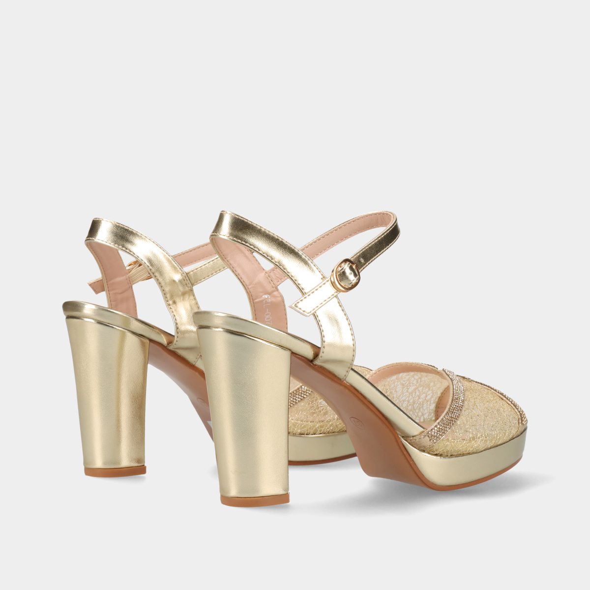 Sandália de salto na cor dourada com tiras de cristais, rede de brilho e fivela lateral para fácil ajuste.