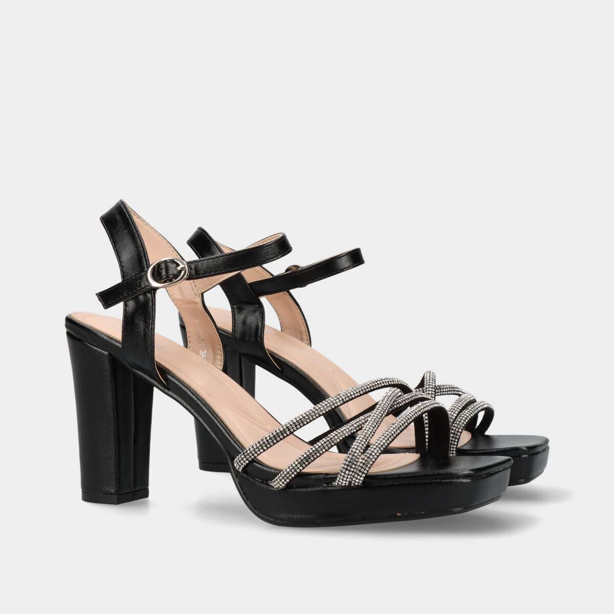 Sandália de salto na cor preta com tiras de cristais e fivela lateral para fácil ajuste.