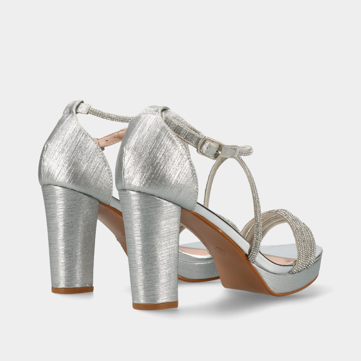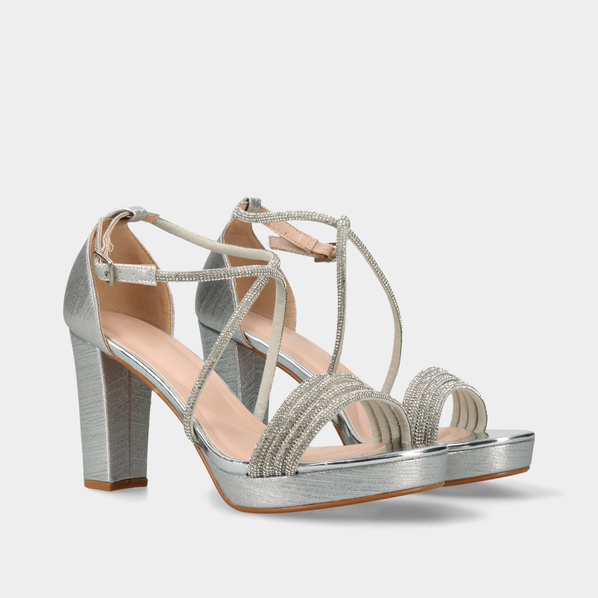 Sandálias prateadas de festa, com salto alto estável e fivela ajustável. Confortáveis e elegantes, ideais para casamentos, festas e ocasiões especiais.