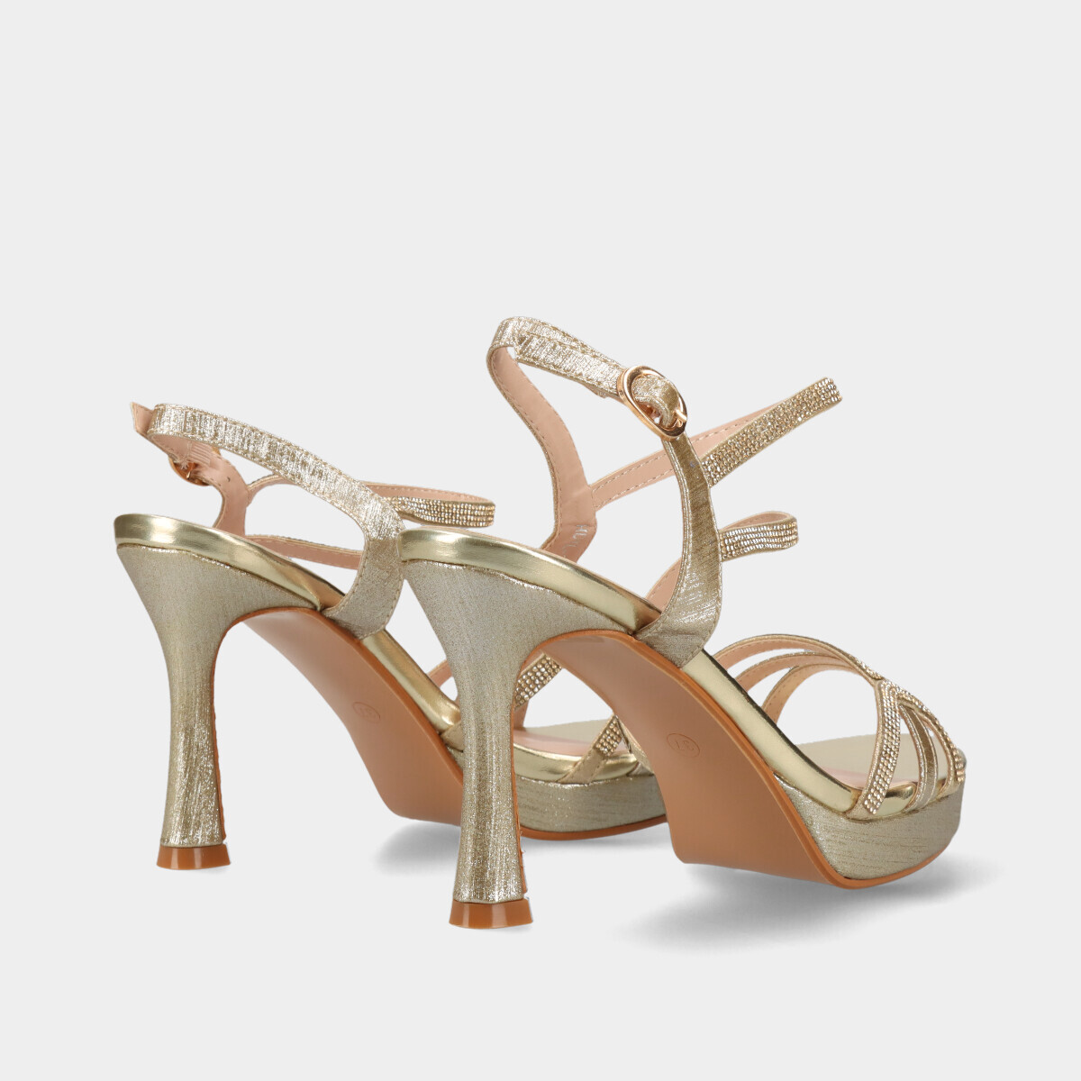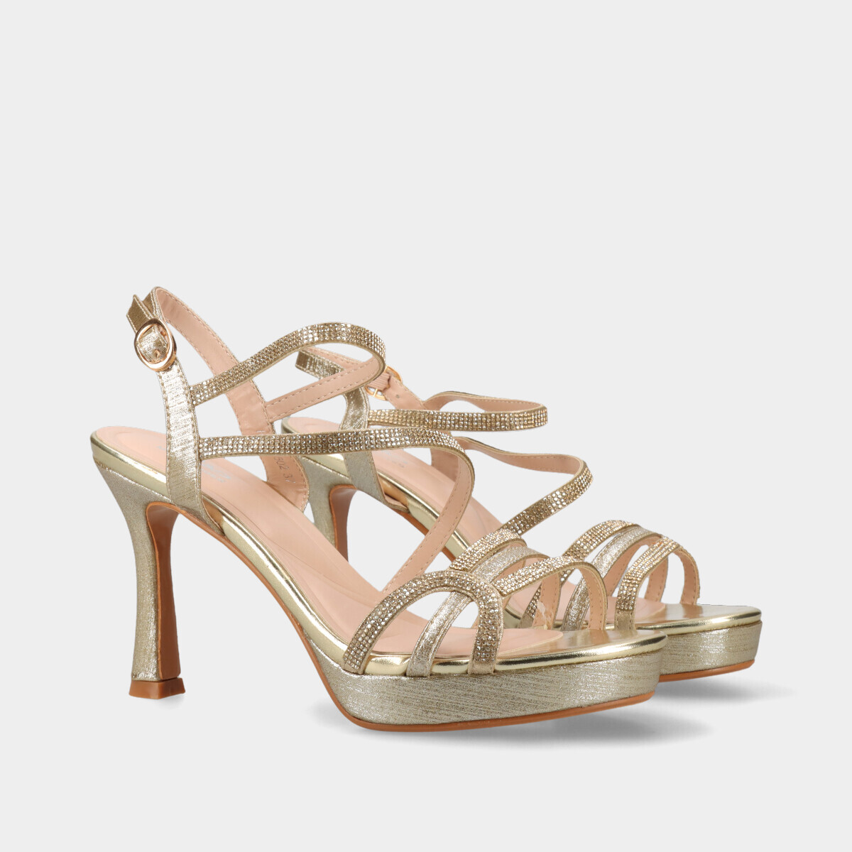 Sandálias douradas de festa, com acabamento brilhante, salto alto estável e fivela ajustável. Confortáveis e elegantes, ideais para casamentos, festas e ocasiões especiais.