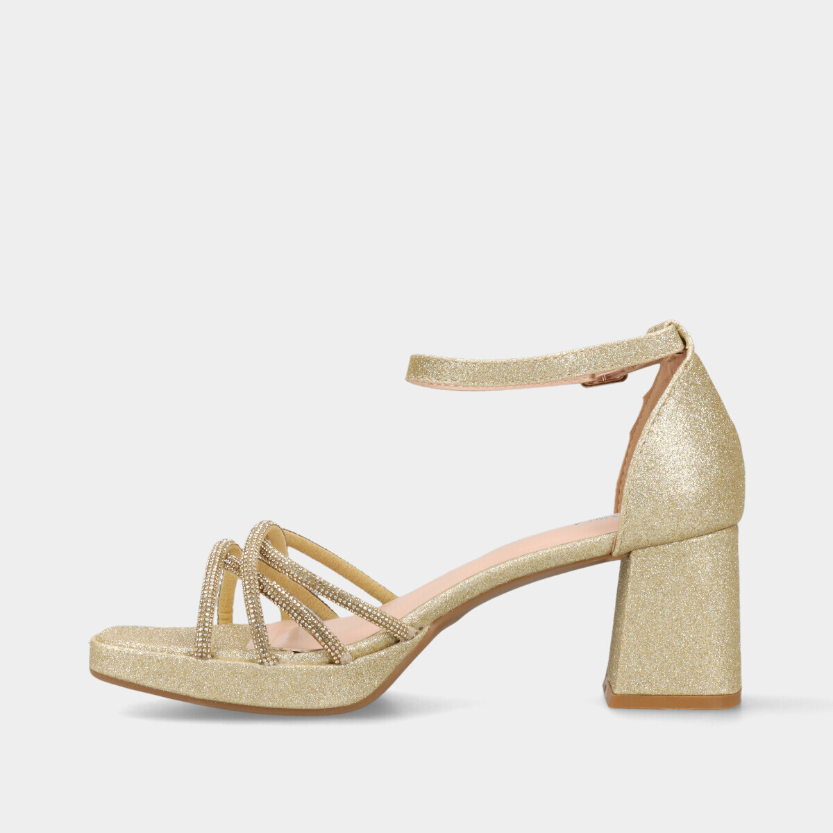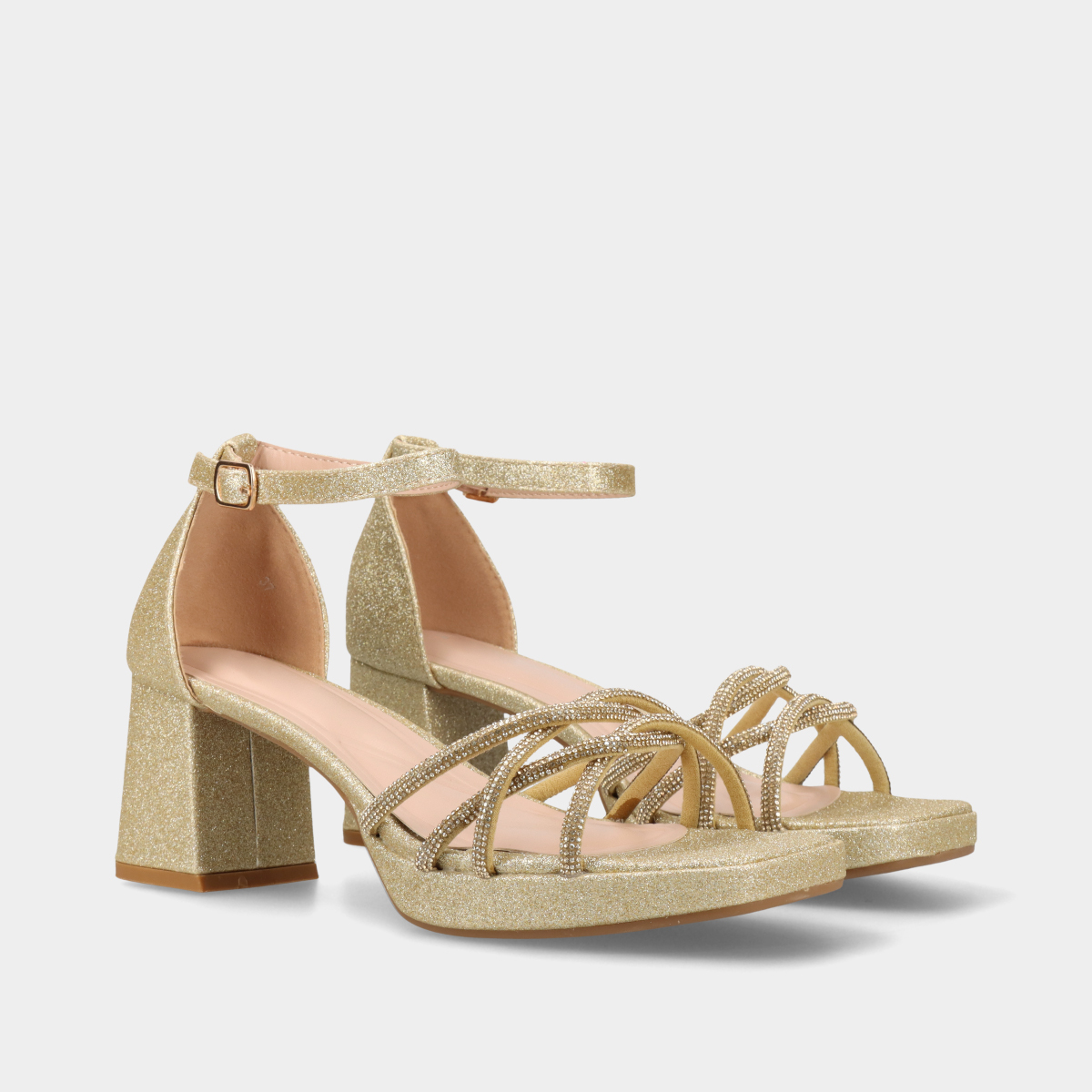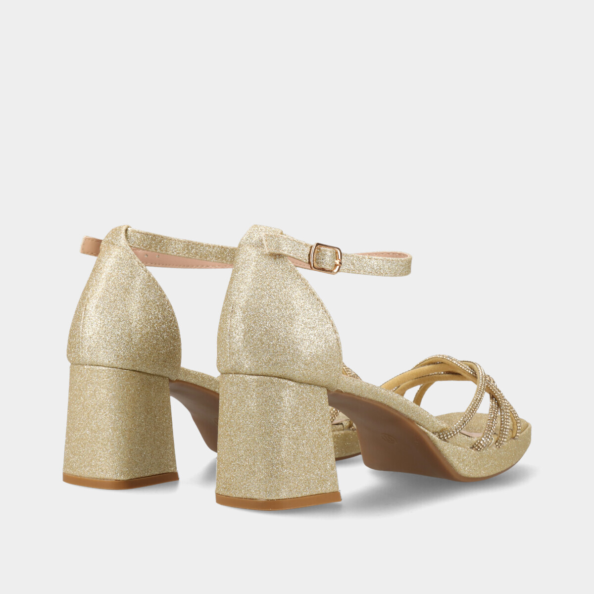 Sandálias douradas de festa, com acabamento brilhante efeito glitter, salto alto estável e fivela ajustável. Confortáveis e elegantes, ideais para casamentos, festas e ocasiões especiais.
