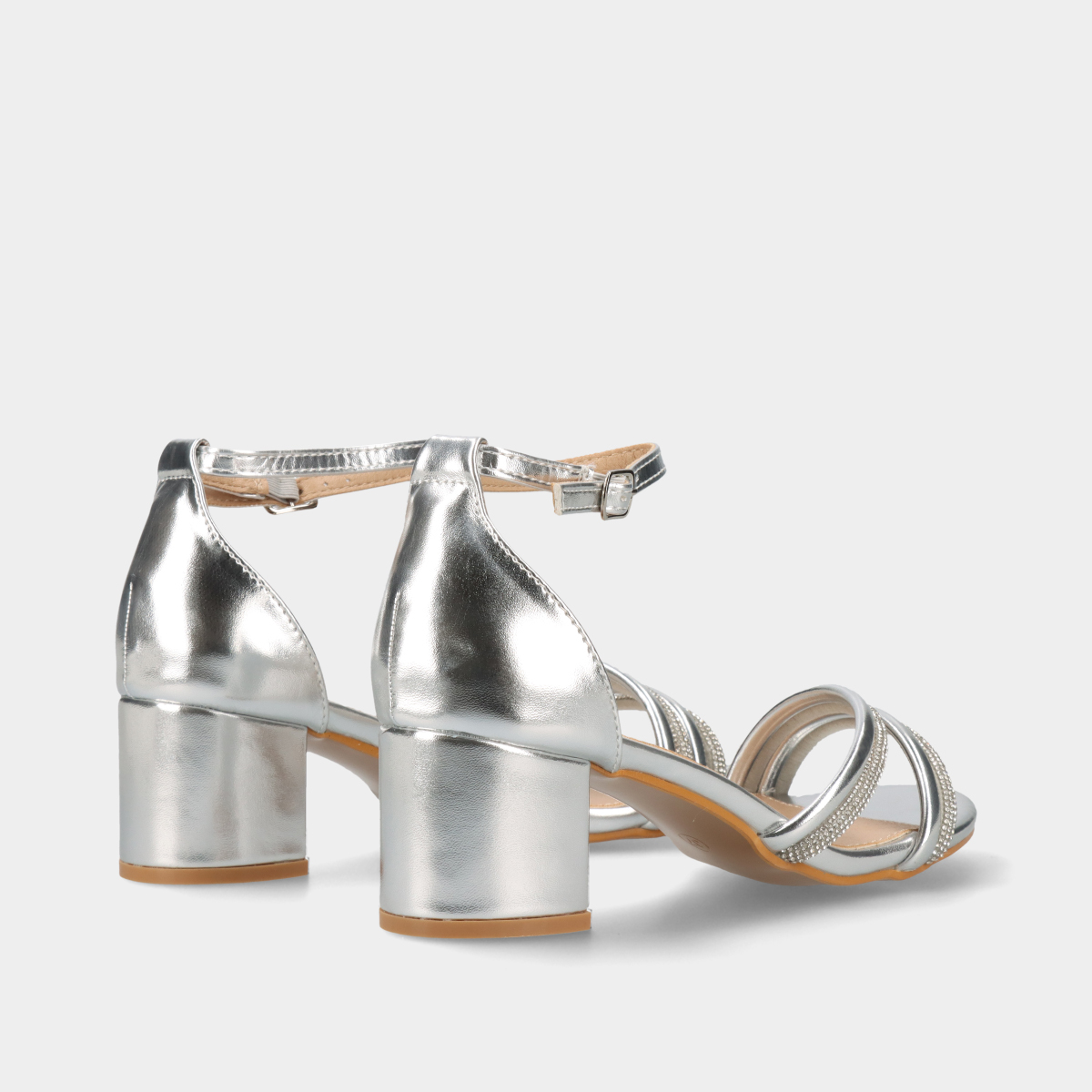 Sandálias prateadas de festa, com salto médio e fivela ajustável. Ideais para festas, casamentos ou ocasiões especiais.