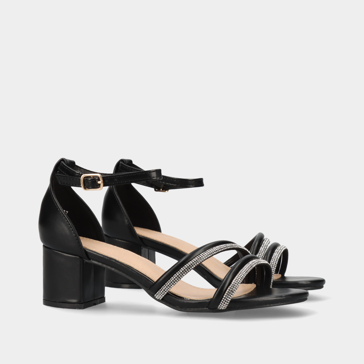 Sandálias pretas de festa, com salto médio e fivela ajustável. Ideais para festas, casamentos ou ocasiões especiais.