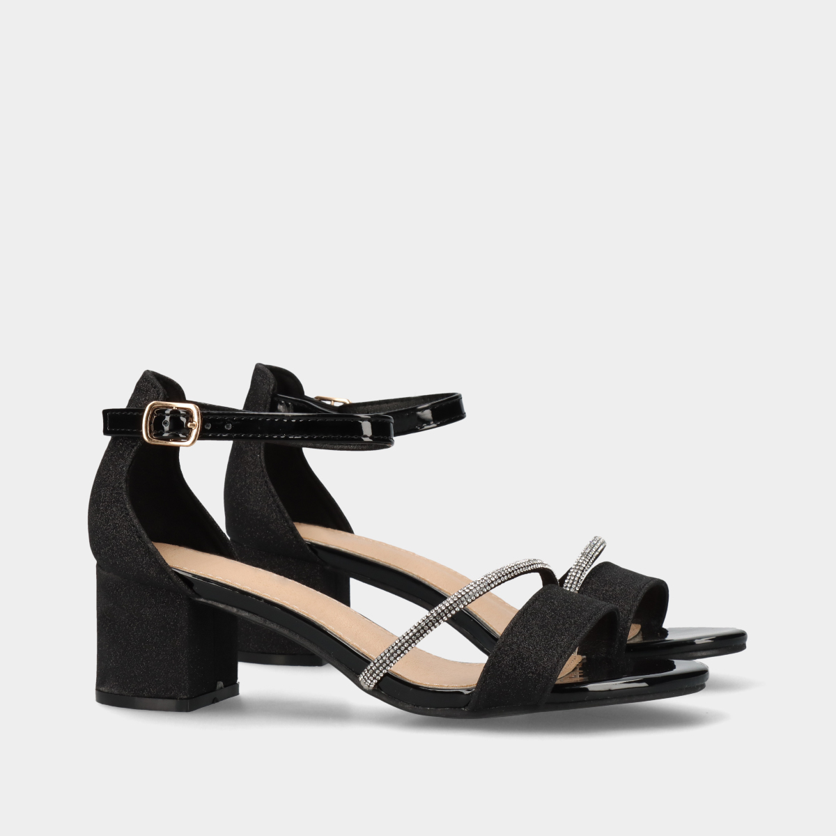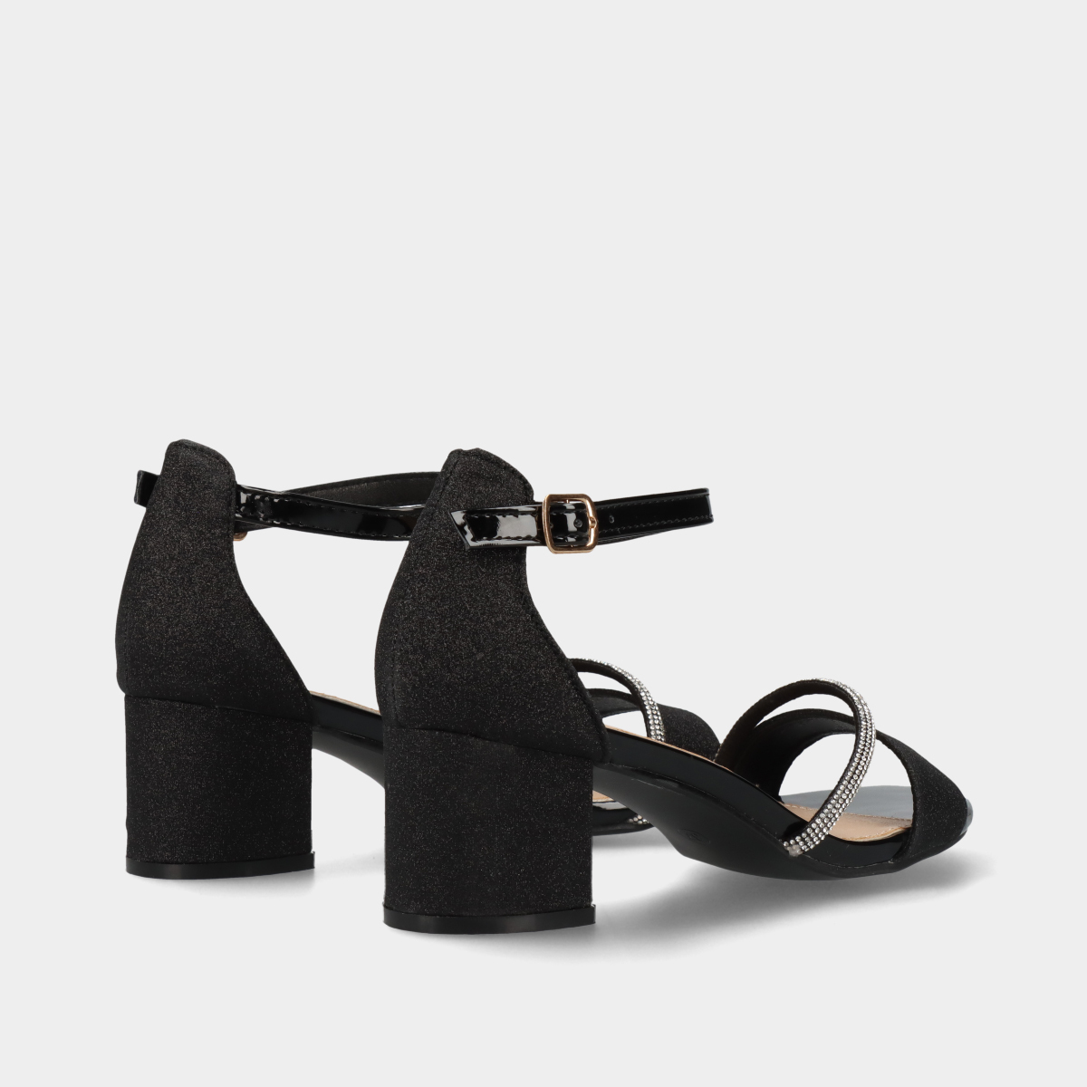 Sandálias de salto médio de 5 cm, com acabamento em glitter, tira brilhante e detalhes em verniz. Calcanhar fechado para maior suporte, frente redonda e fivela ajustável no tornozelo.