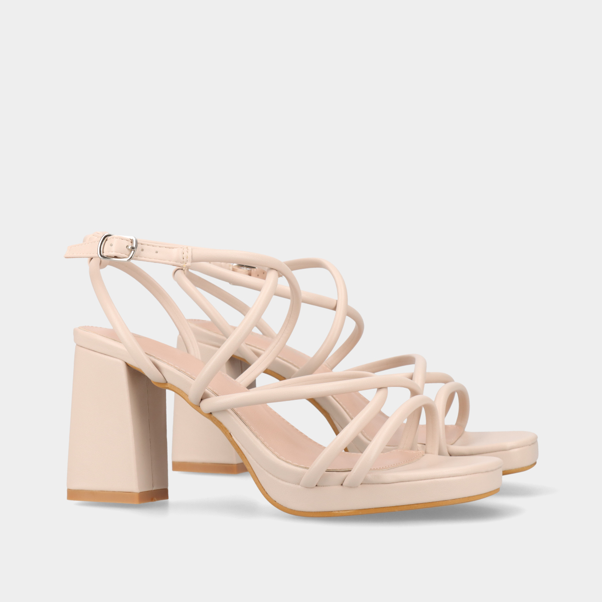 Sandálias de salto alto estável e confortável, na cor bege, com tiras finas e fivela lateral para um ajuste fácil e seguro.