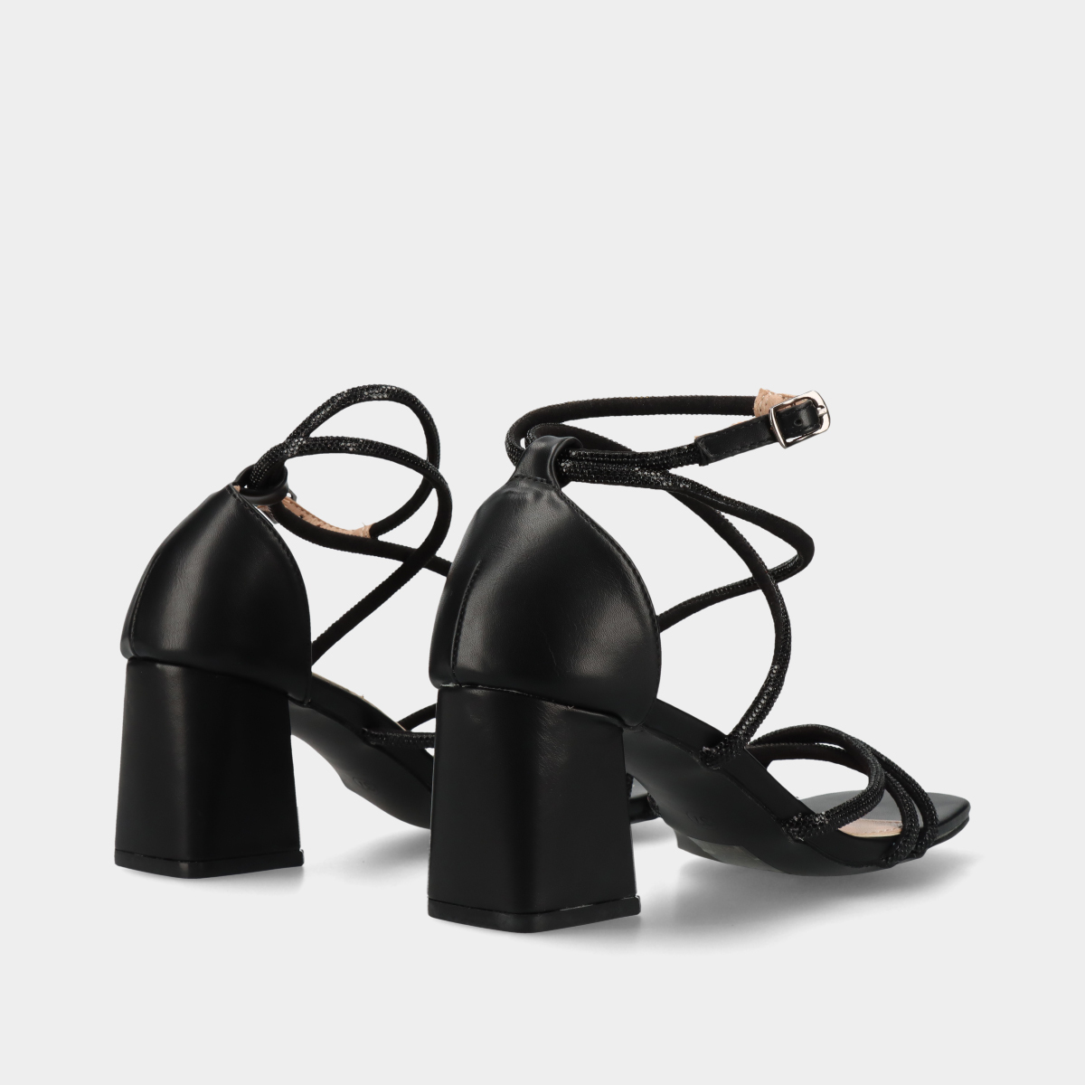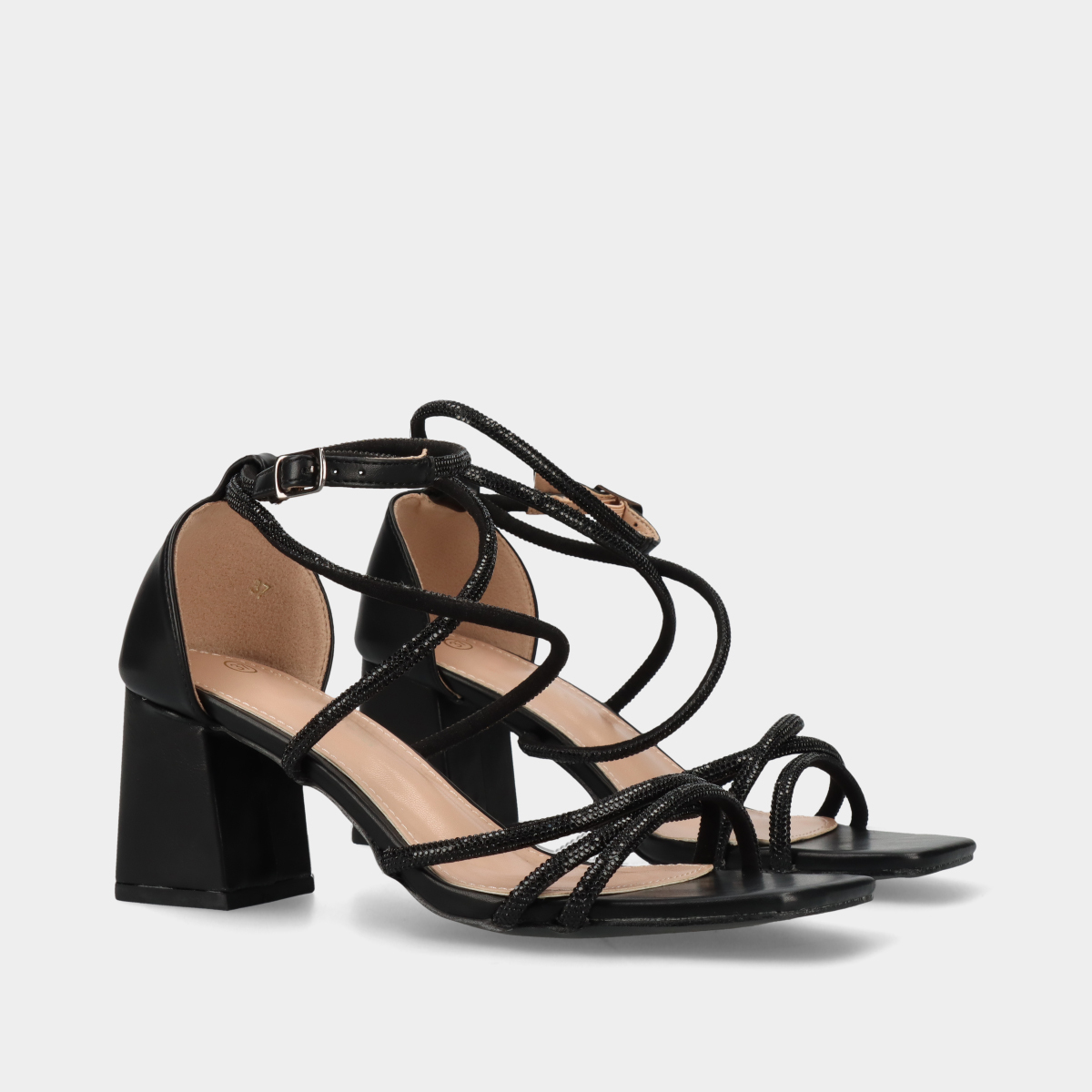 Sandálias pretas de festa, com salto médio largo e fivela ajustável. Confortáveis e elegantes, ideais para casamentos, festas e ocasiões especiais.